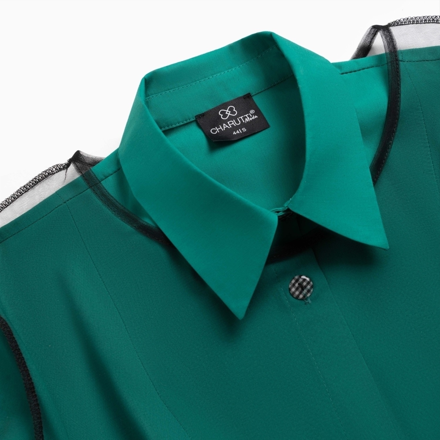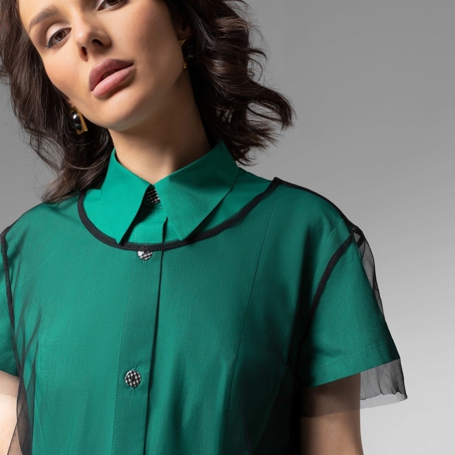 Состав: «Поплин тиси», «сетка» (45% хлопок, 30% полиэстер, 25% нейлон) Плотность ткани: Средняя Тип ткани: Трикотаж, текстиль Вид застежки: Пуговица/-ы Декоративные элементы: Завязки Дополнительный цвет ткани: Черный Карманы: Нет Основной цвет ткани: Зелёный Отрезная талия: Нет Подклад: Нет Резинка по талии: Нет Рисунок/раппорт: Нет, все изделия идентичны Сезон: Лето Силуэт: Прилегающий Стиль: Нарядный Параметры модели на фото: