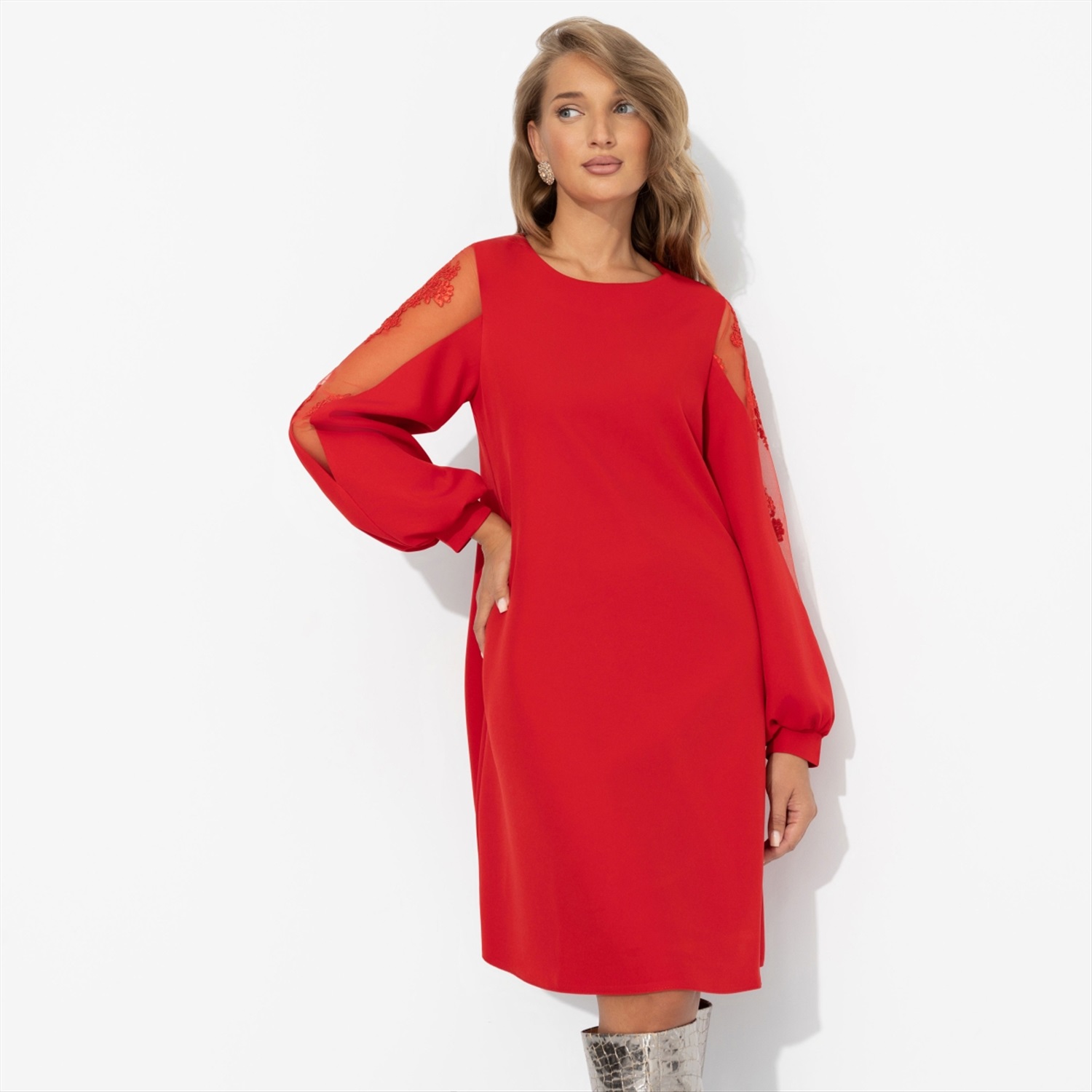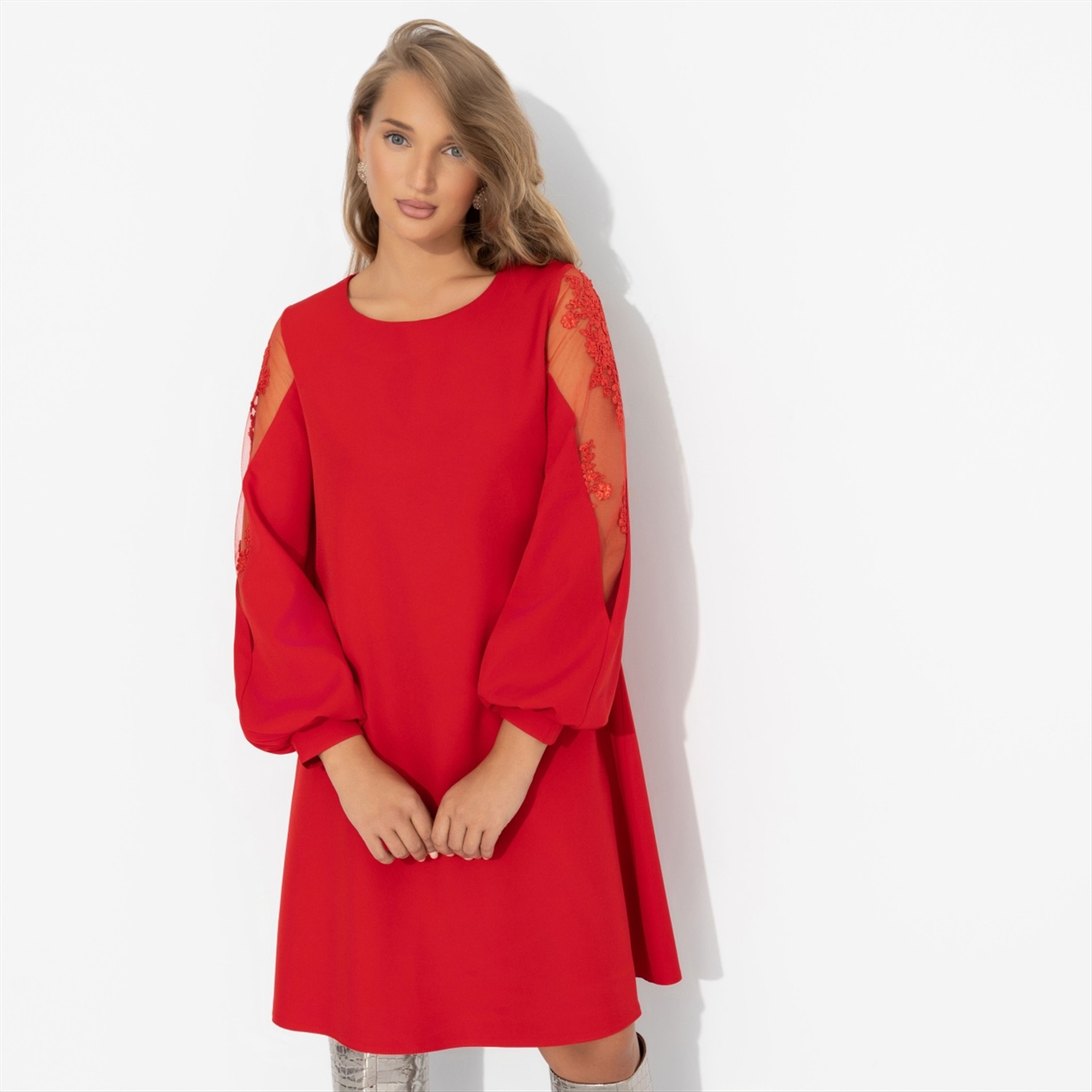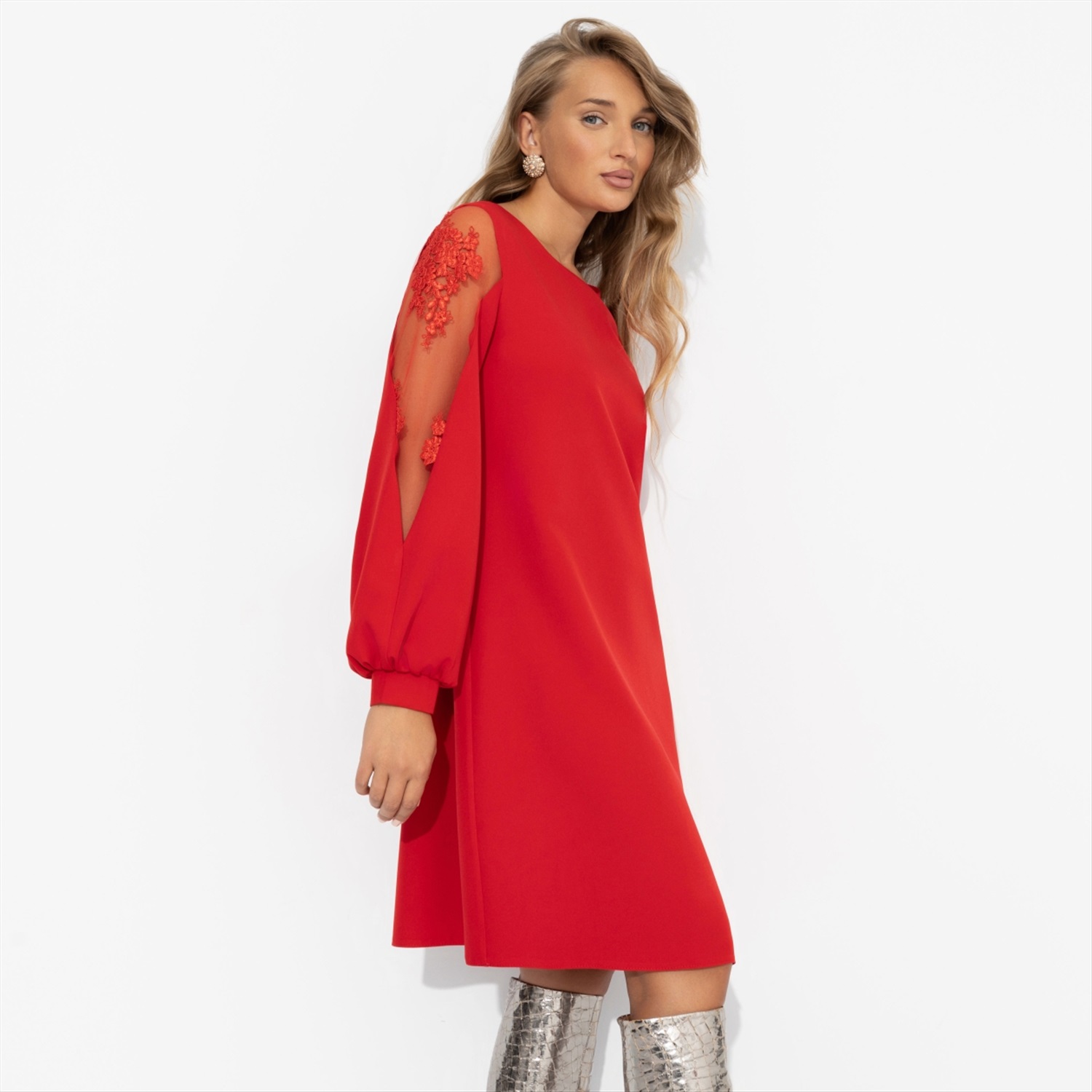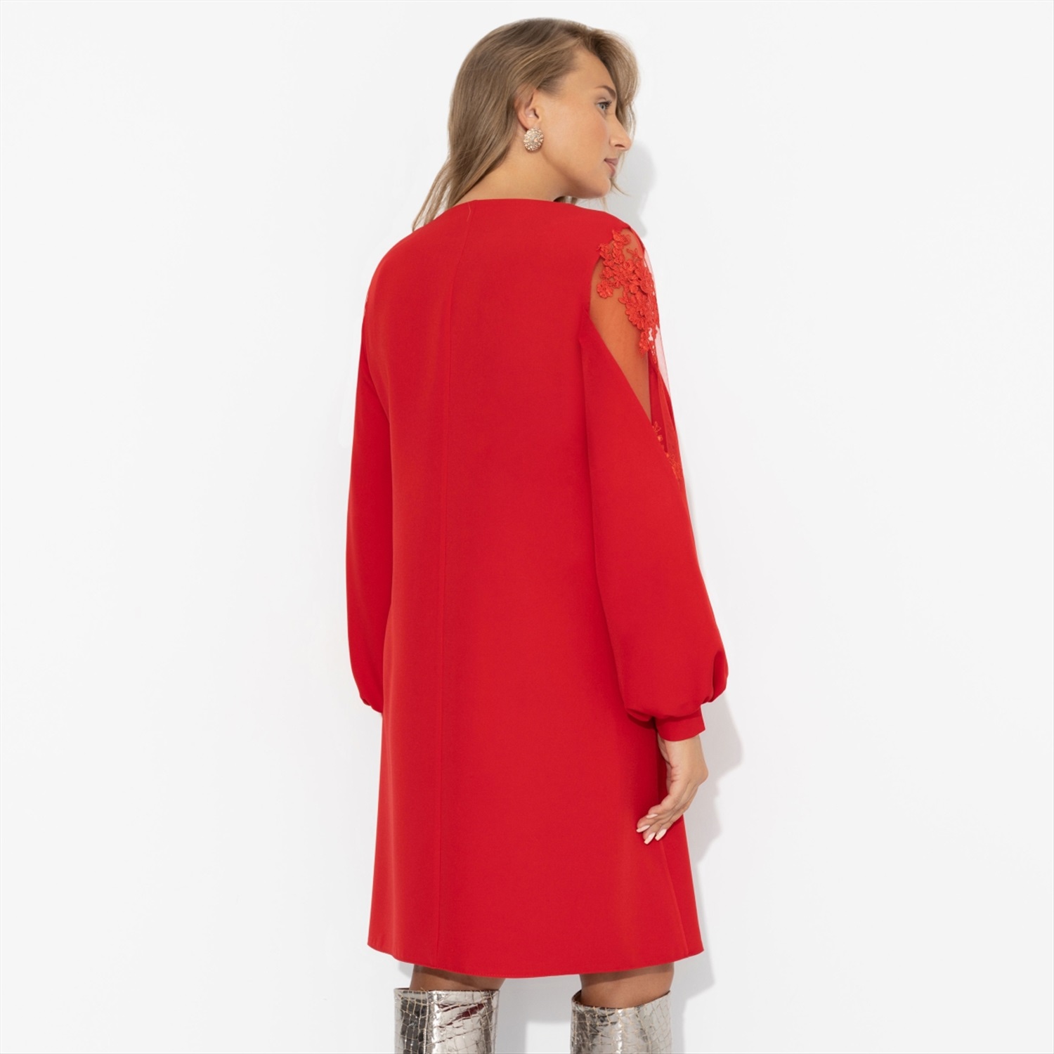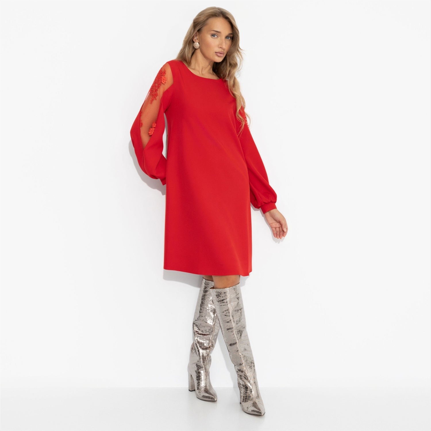 Платье ЧАРУТТИ как вспышка страсти, которую она носит с собой, но открывает лишь избранным. В нём каждый шаг становится признанием, а силуэт шепчет об уверенности, рождённой из глубины самопознания. Платье только для тех, кто понимает: любовь к себе начинается со смелого решения надеть самый яркий цвет. Платье трапециевидного силуэта в длине до колена. Длинные рукава-фонарики дополнены тонким кружевом в тон изделия. Платье хорошо смотрится на любом типе фигуры.