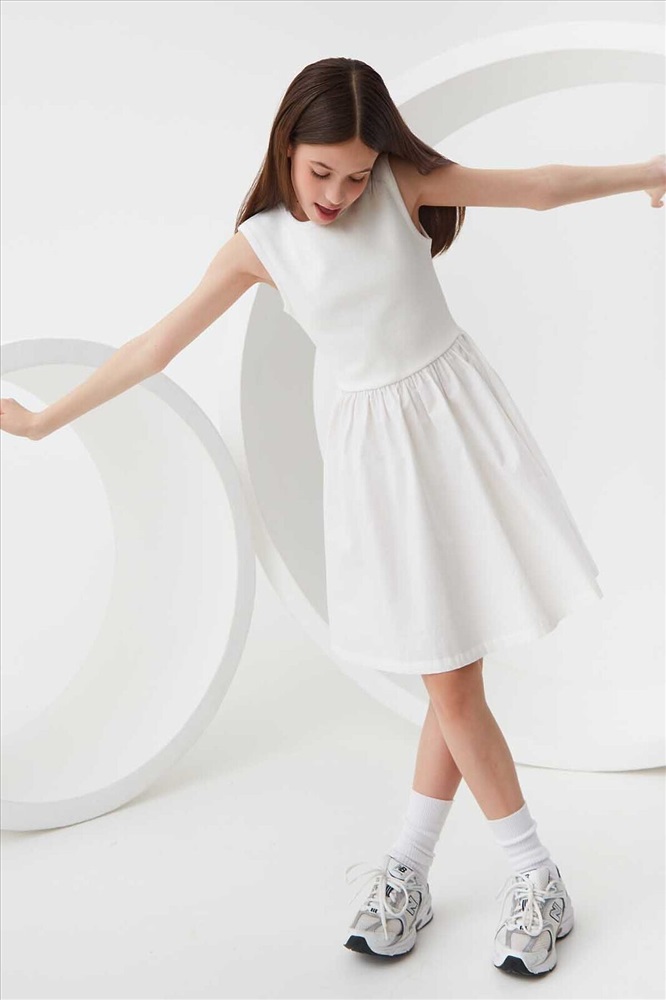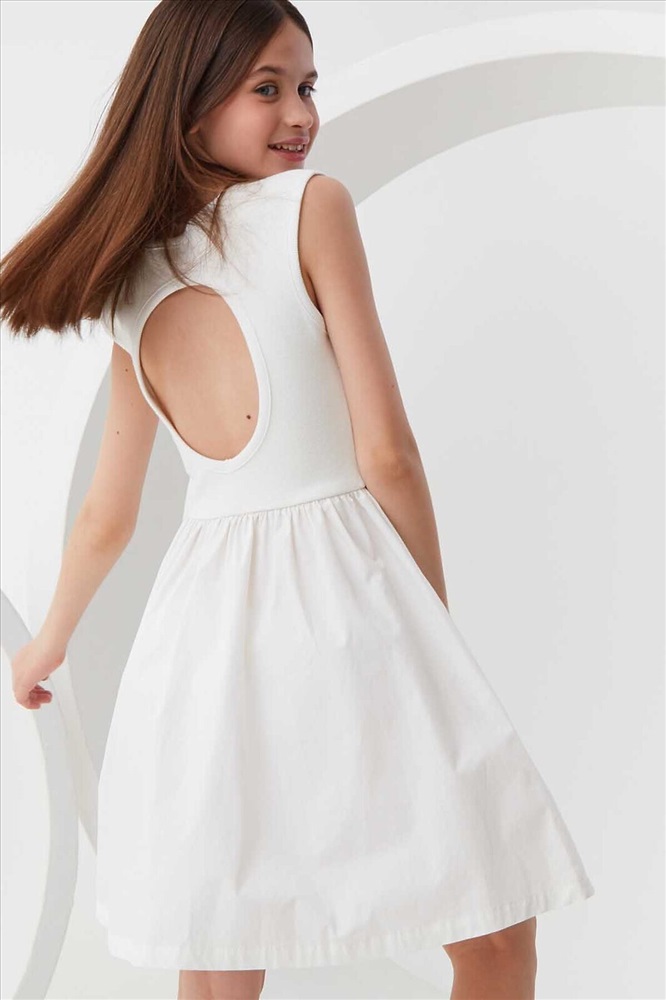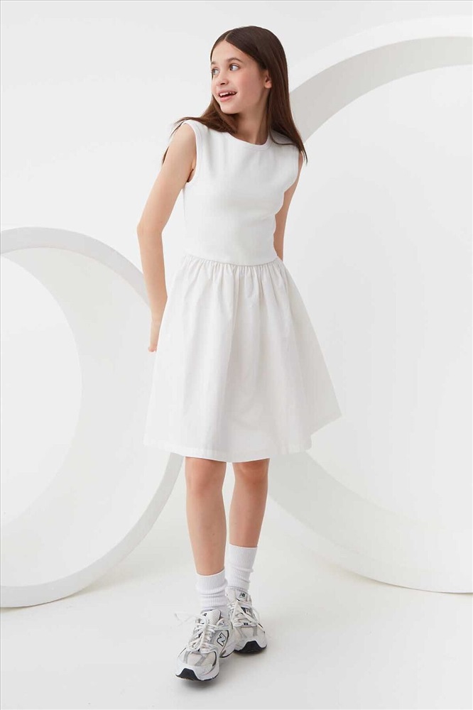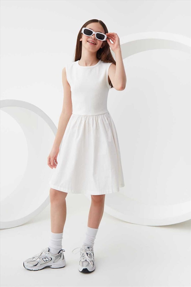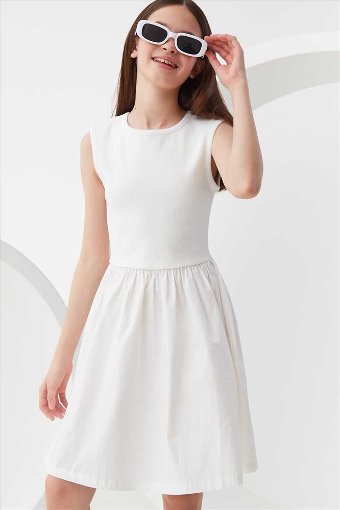 Комбинированное летнее платье длины миди с круглым вырезом на спине. Лиф из мягкого трикотажа в рубчик полуприлегающего кроя. Юбка А-силуэта из плотной хлопковой ткани. Крой с пышной юбкой позволит быть самой активной. Акцент на талии формирует утончённый силуэт. Широкие бретели и U-образный вырез на груди и спинке. Размерный ряд 128 – 176 см.