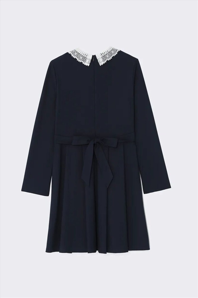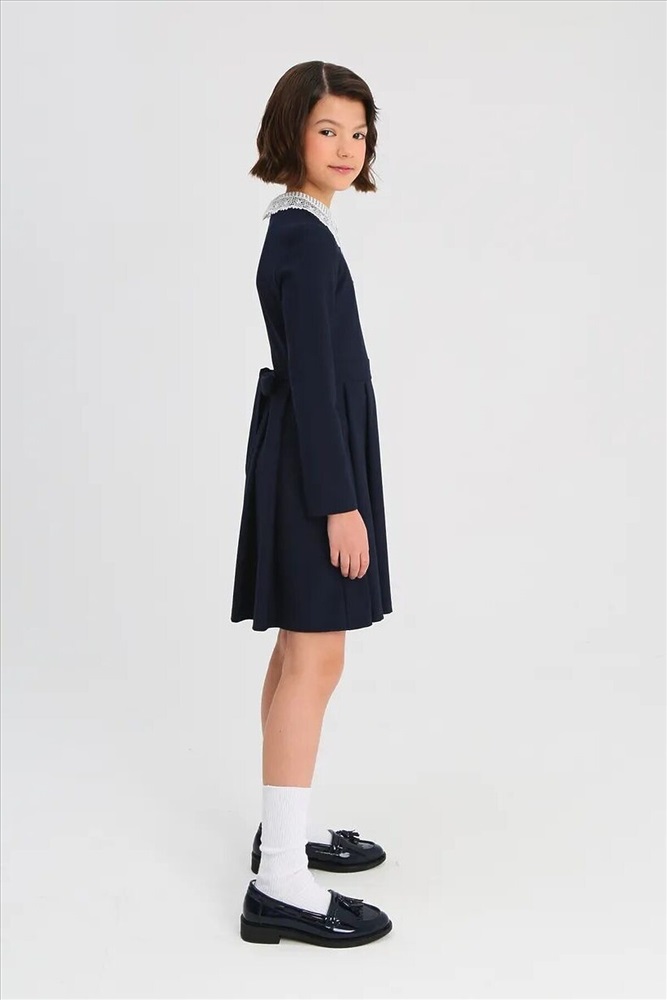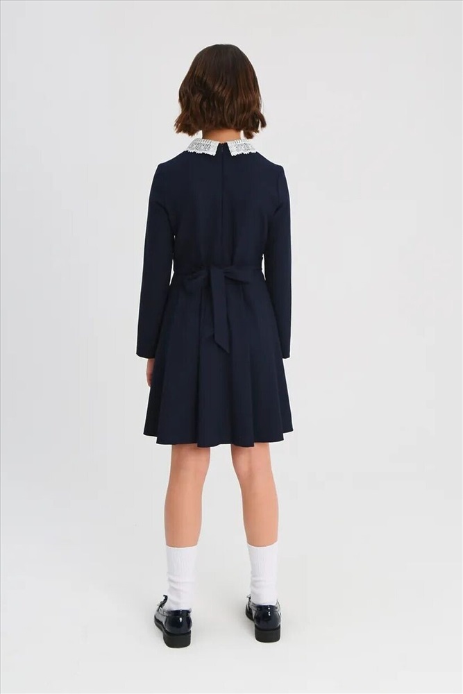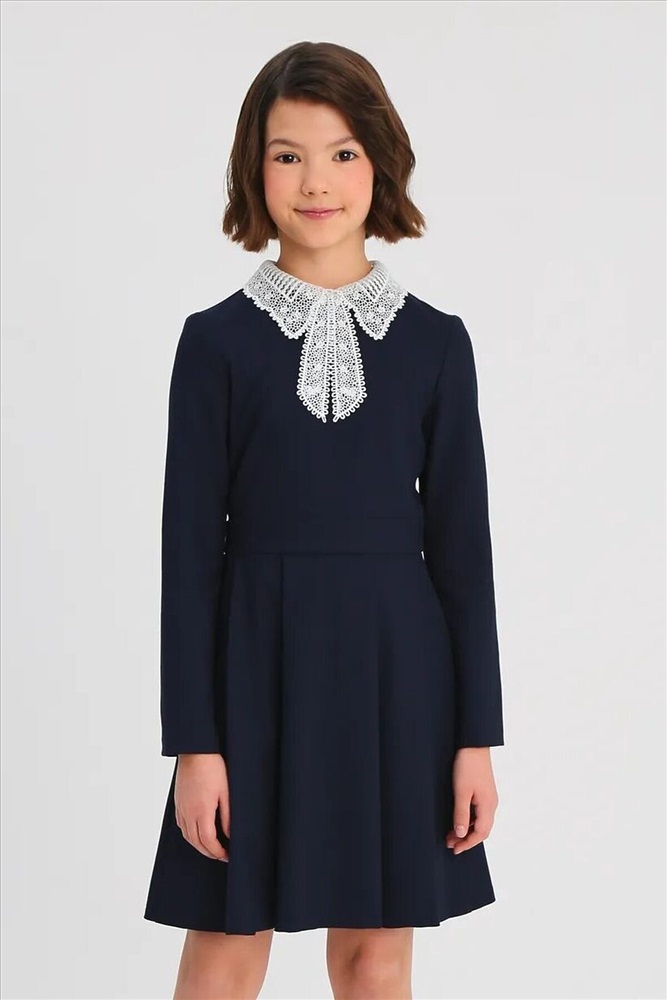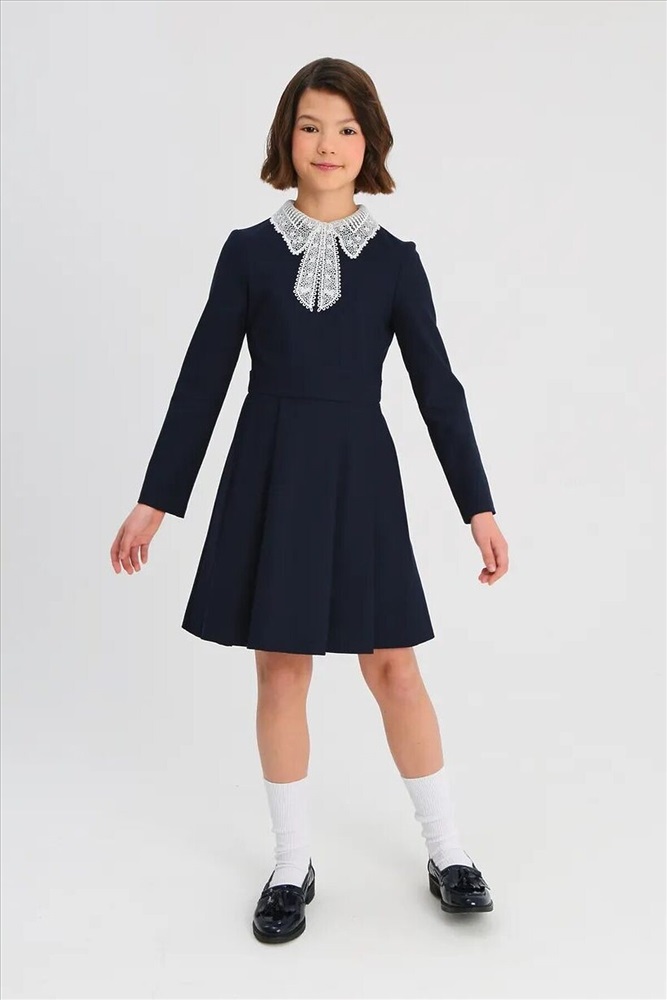 ID товара: 1104161 Состав: 48% Вискоза, 48% Полиэстер, 4% Полиуретан Сезон: Весна/Лето Длина: Короткая Фасон: Полуприталенный Рукав: Длинные Вырез горловины: Округлый Рисунок: нет Основная ткань: Вискоза Стиль: Деловой Страна бренда: Россия Страна производства: Россия Эффектное платье для девочки школьное из смесовой вискозы с отложным кружевным воротником с прямыми концами и «бантом» белого цвета, с длинными втачными рукавами и юбкой с мягкими складками. На передней части платья для девочек школьные имитация пояса, концы которого сзади переходят в несъемные полупояса и завязываются на бант. Платье выполнено из износостойкой костюмной поливискозы с добавлением эластичных волокон, обеспечивающих комфорт в движении. Потайная молния на спинке - удобная застежка, с которой справится даже первоклашка. Комментарии к товару