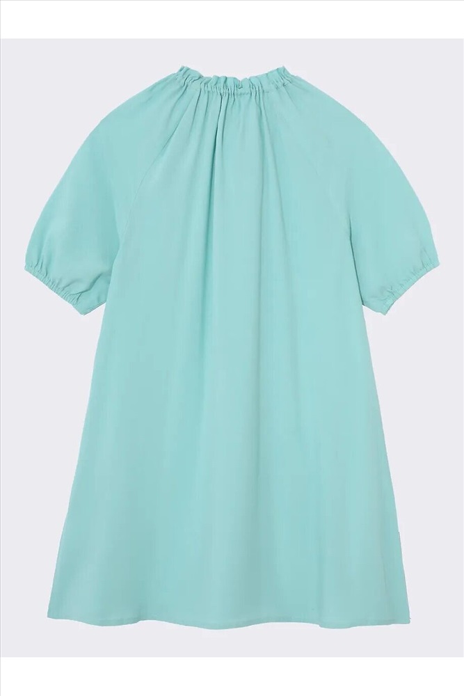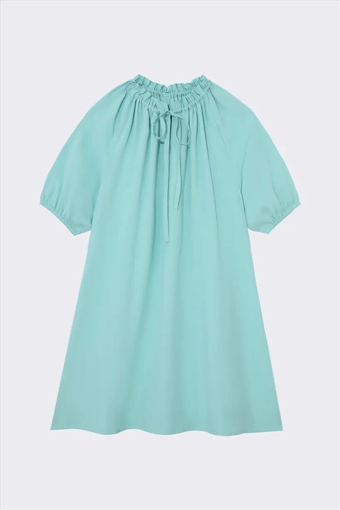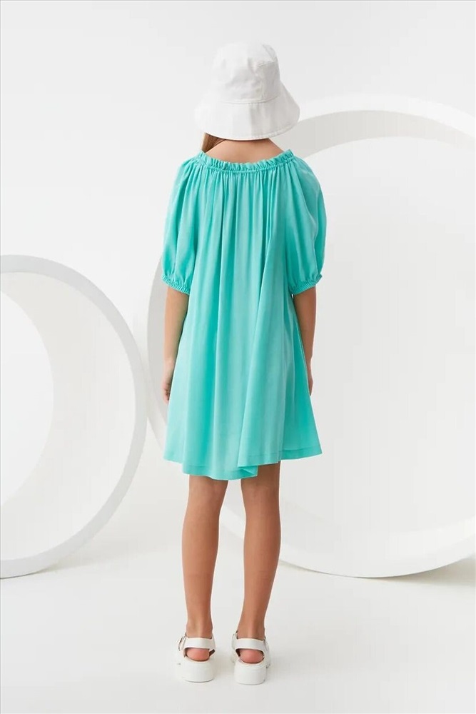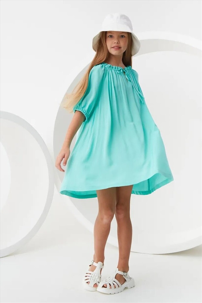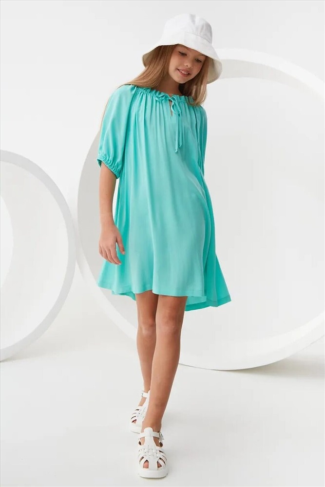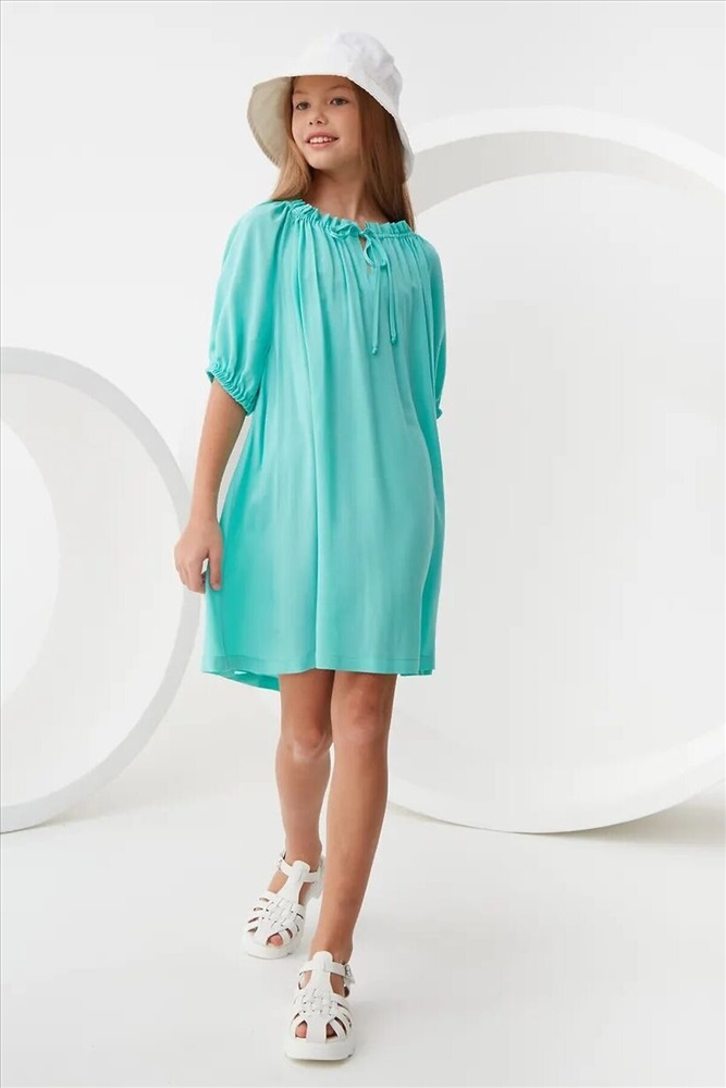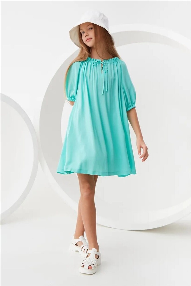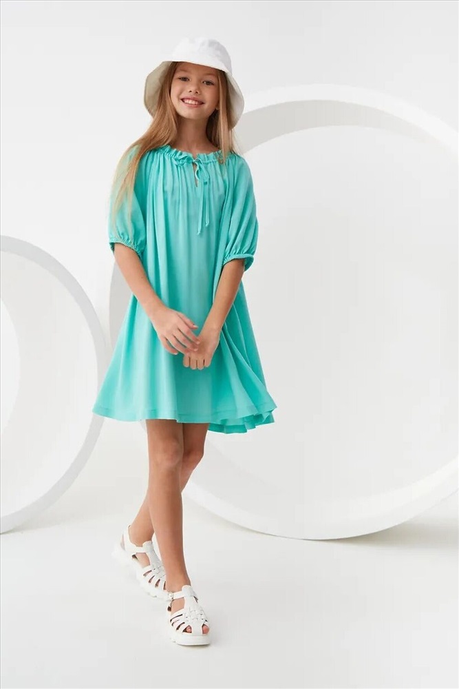 Платье летнее из 100% вискозной ткани. Платье без подкладки и без застежки. Силуэт платья расклешается книзу. По центру переда от горловины обработан разрез. Рукава короткие, покроя реглан. Низ рукавов вложена резинка. Вырез горловины широкий. В кулису вложена завязка из косой бейки из основной ткани,. Завязка присобирает горловину платья и завязывается на бант. Низ платья застрочен швом вподгибку с закрытым срезом. Размерный ряд 116-152 см.