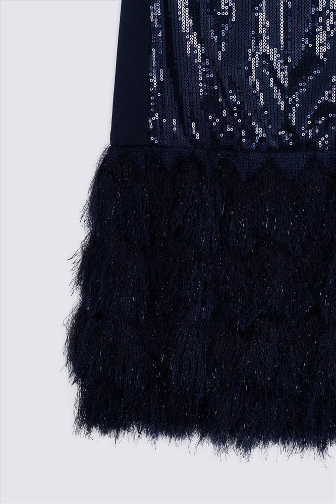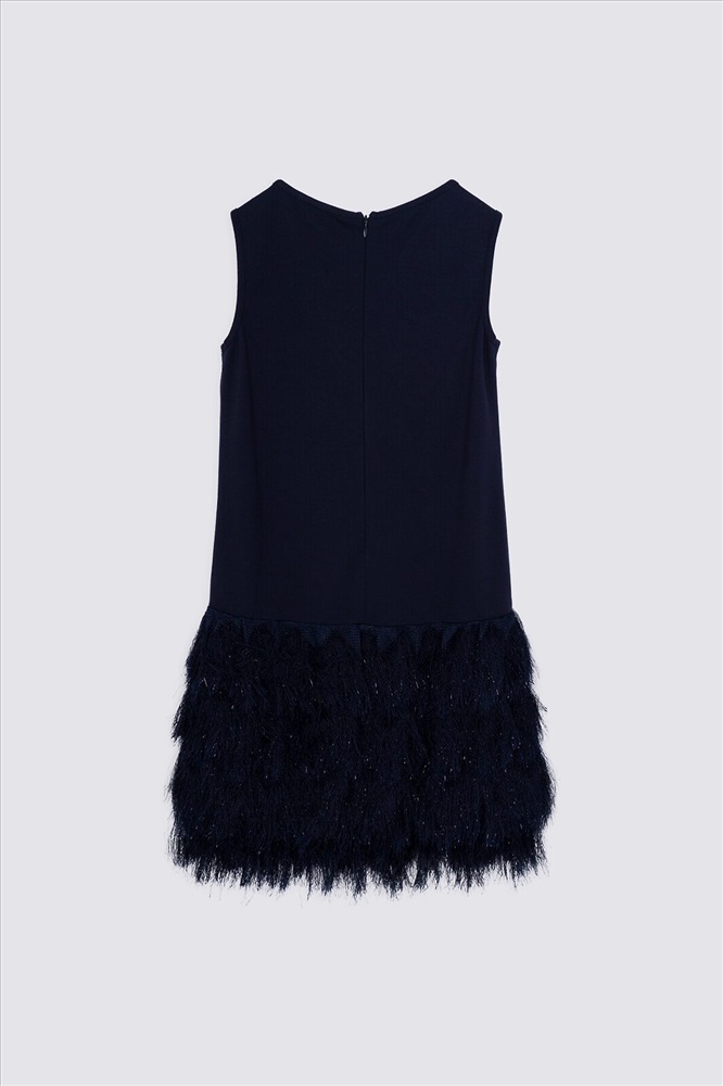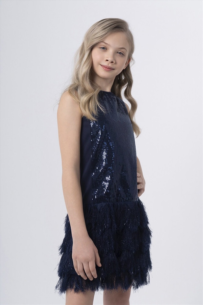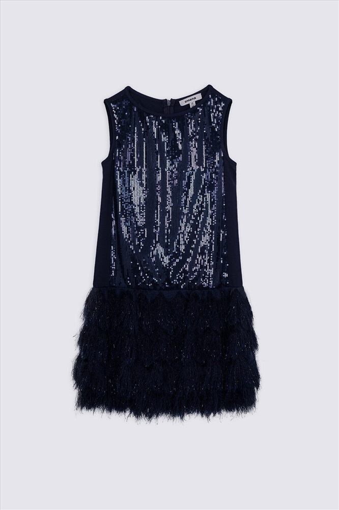 Платье в ретро стиле без рукавов с акцентом на заниженной линии талии. Лиф усыпан блёстками. Юбка изготовлена из ткани с длинным ворсом и имеет хлопковую подкладку для максимального комфорта. Застежка на скрытой молнии, расположенная на спинке. Такое платье станет верным спутником на любом торжественном мероприятии или вечернем выходе. Оно позволяет создавать образы с ноткой винтажной роскоши.