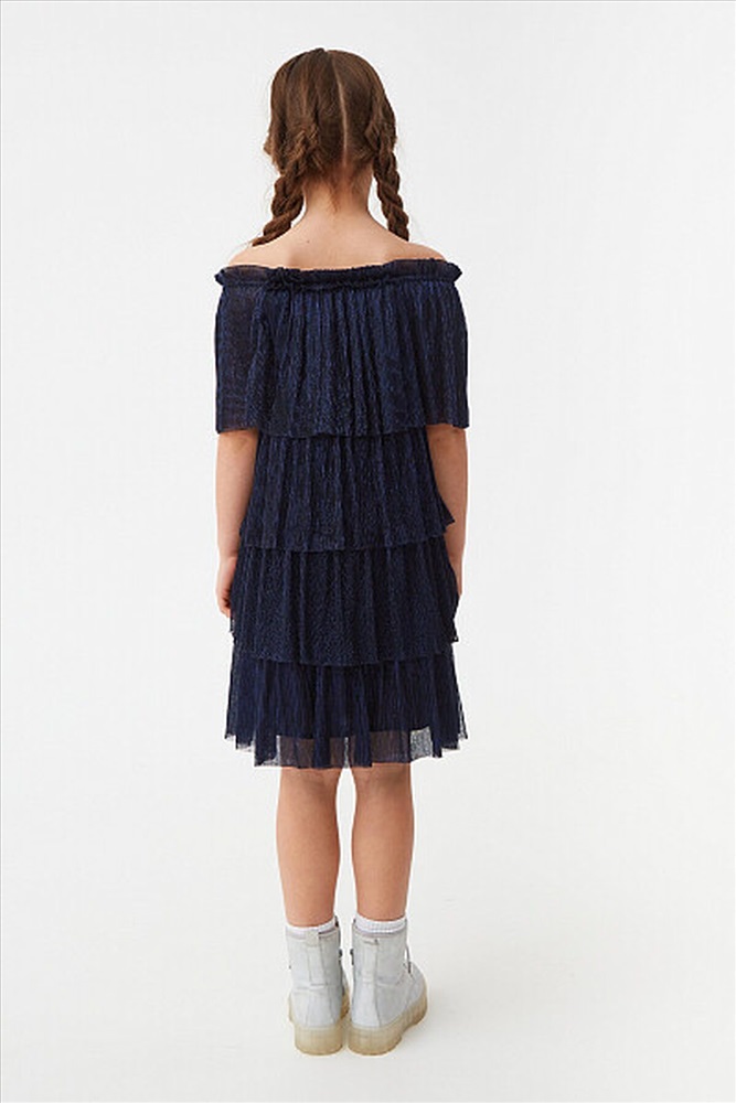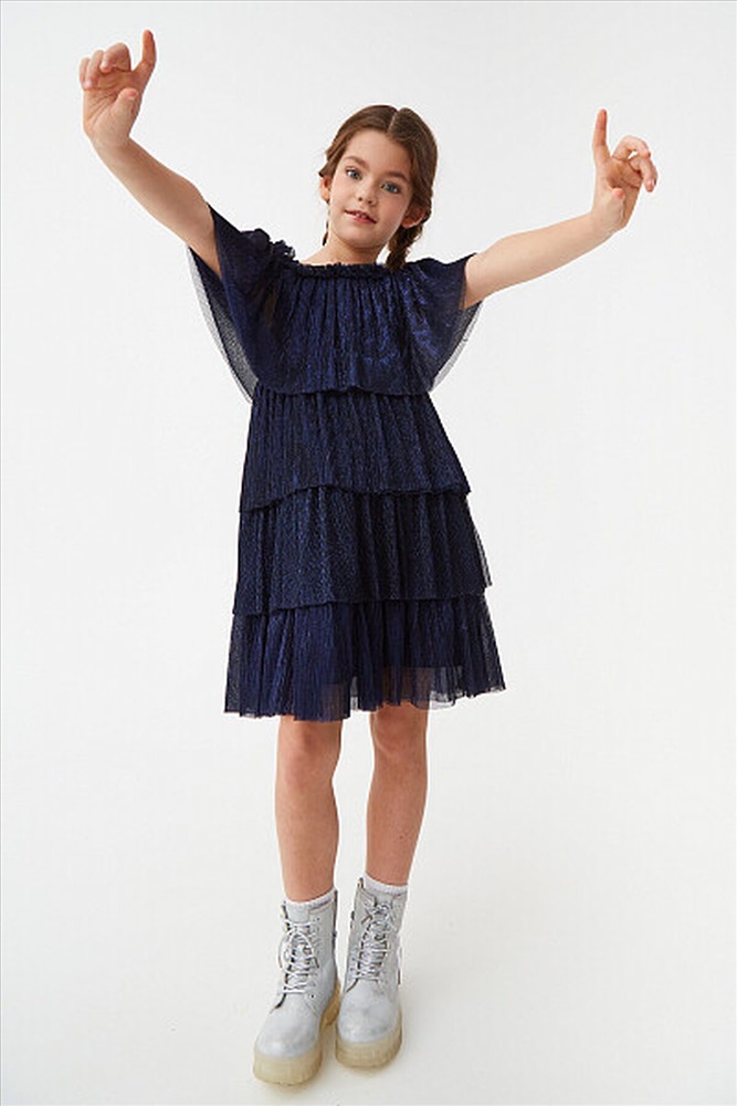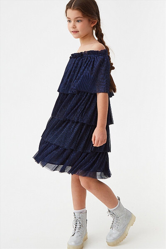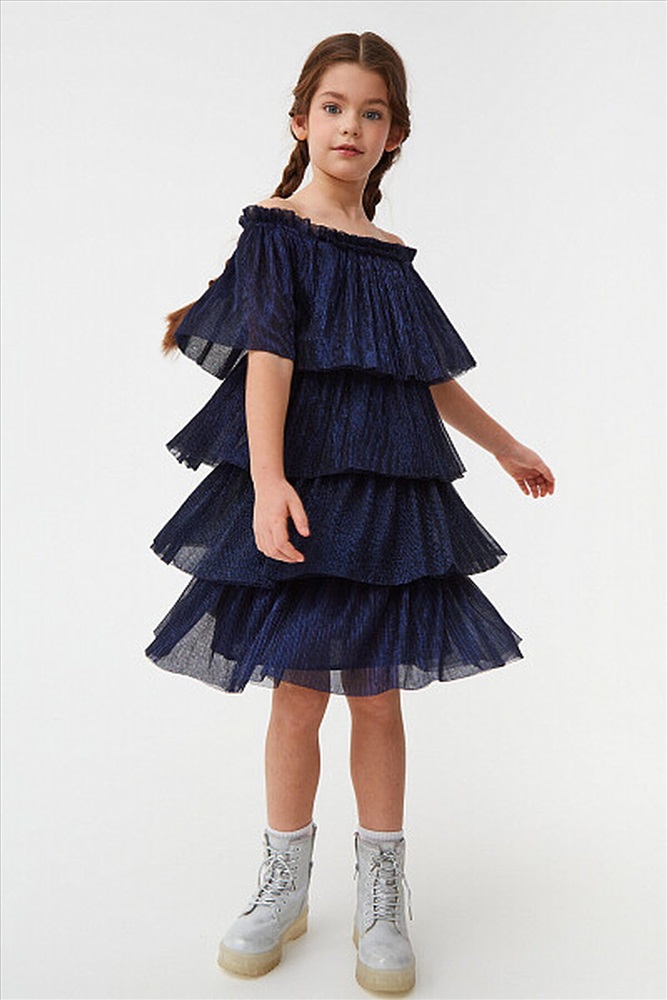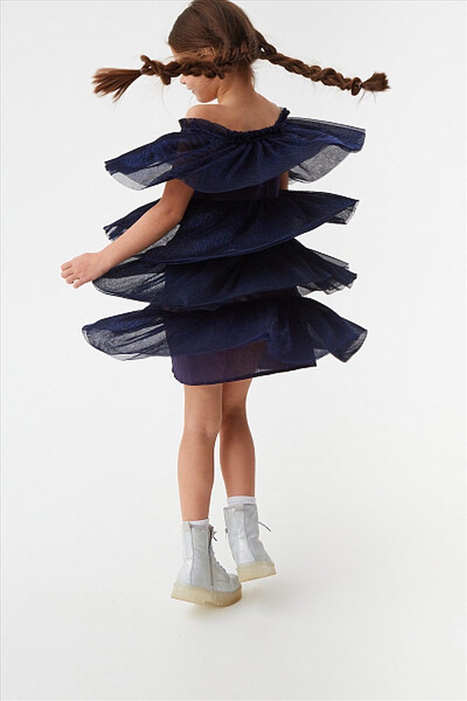 Платье силуэта трапеция на хлопковой подкладке. Многослойность—главное украшение изделия: четыре яруса ткани, дополнены двойными оборками из плиссированной сетки. На платье отсутствуют застёжки —девочка сможет спокойно надеть его без лишних усилий. Горловина с резинкой, рукава дополнены оборками.