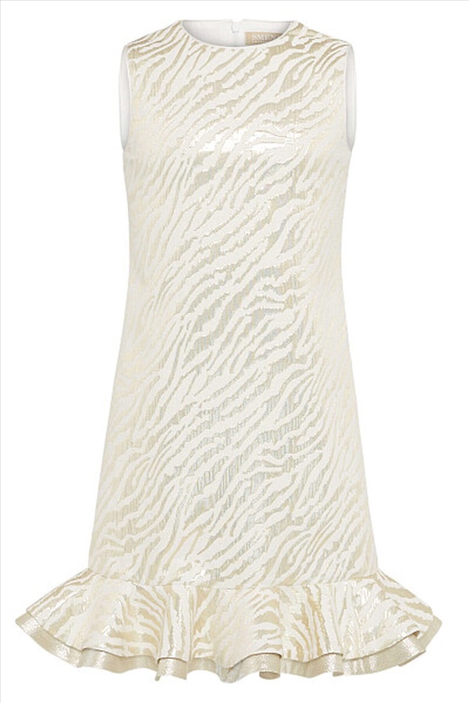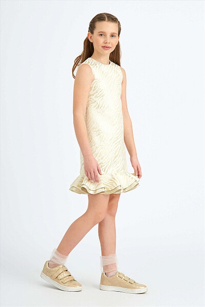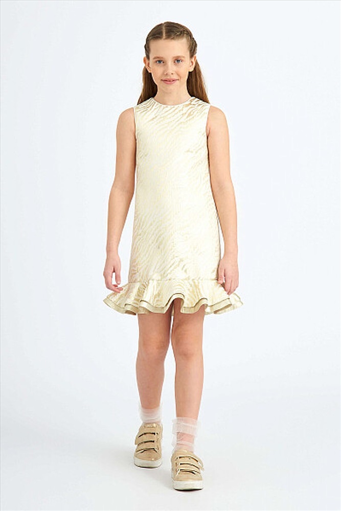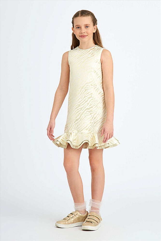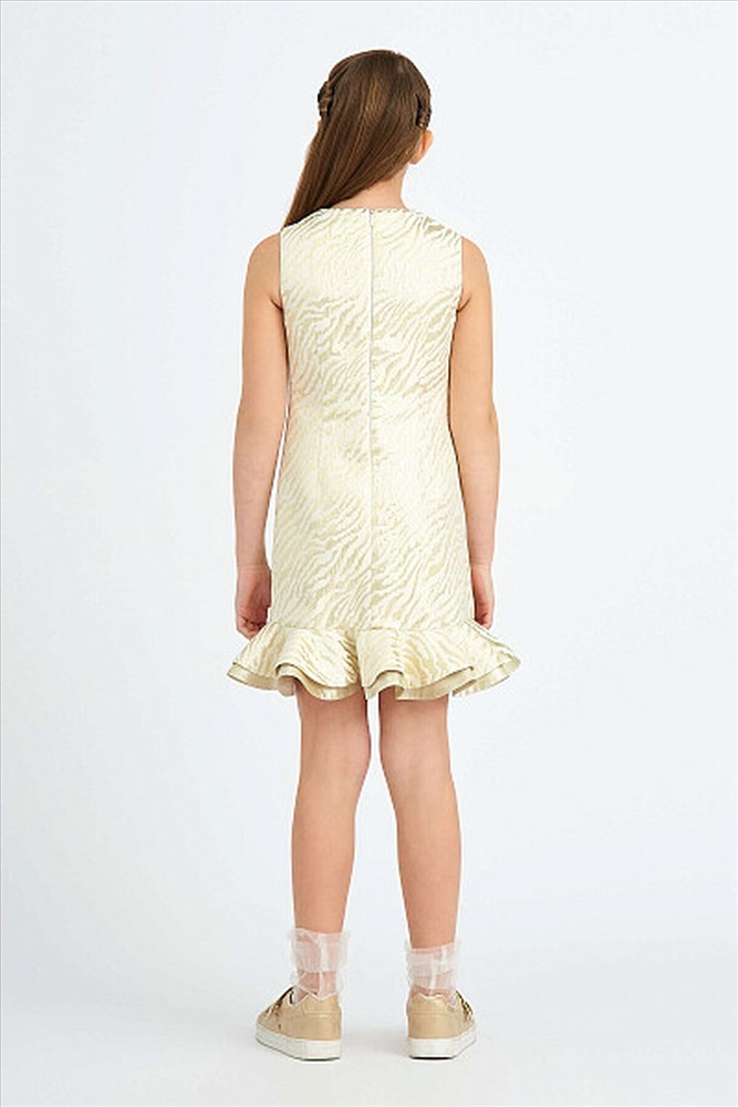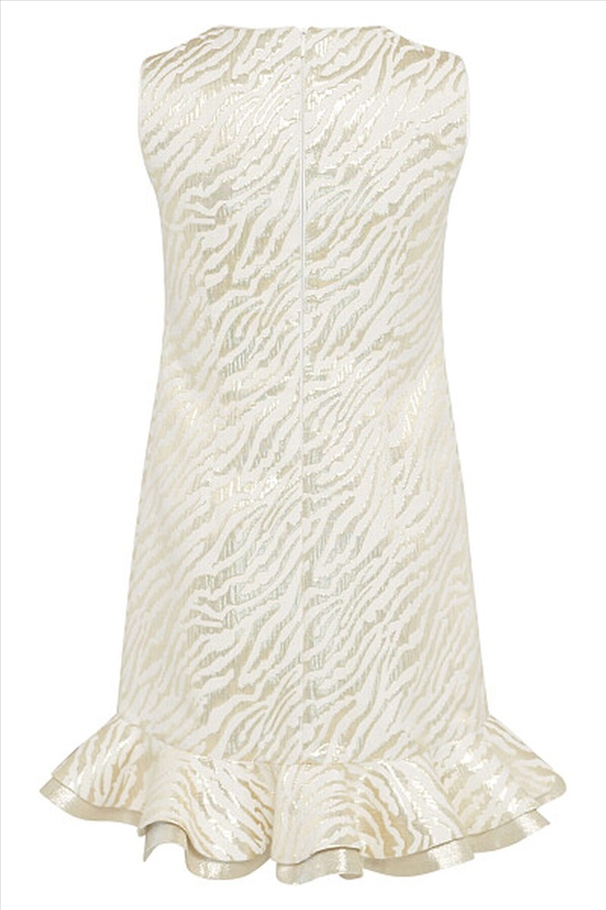 Эффектное платье А- силуэта из жаккарда "тигр" с двойным воланом по низу. Застёжка на потайную молнию по центру спинки. Подкладка хлопок.