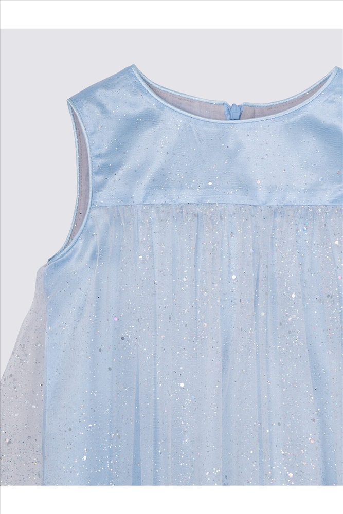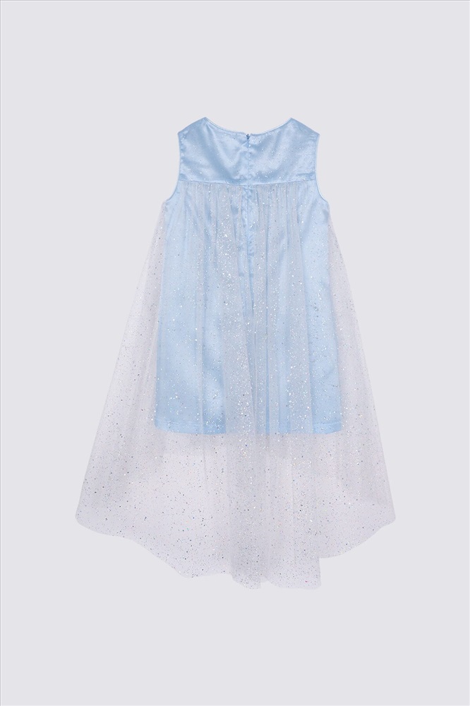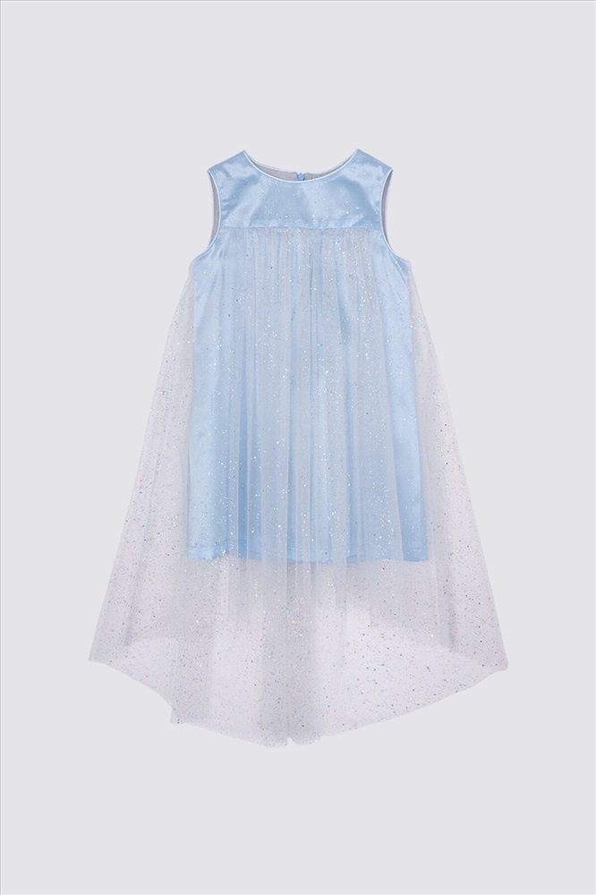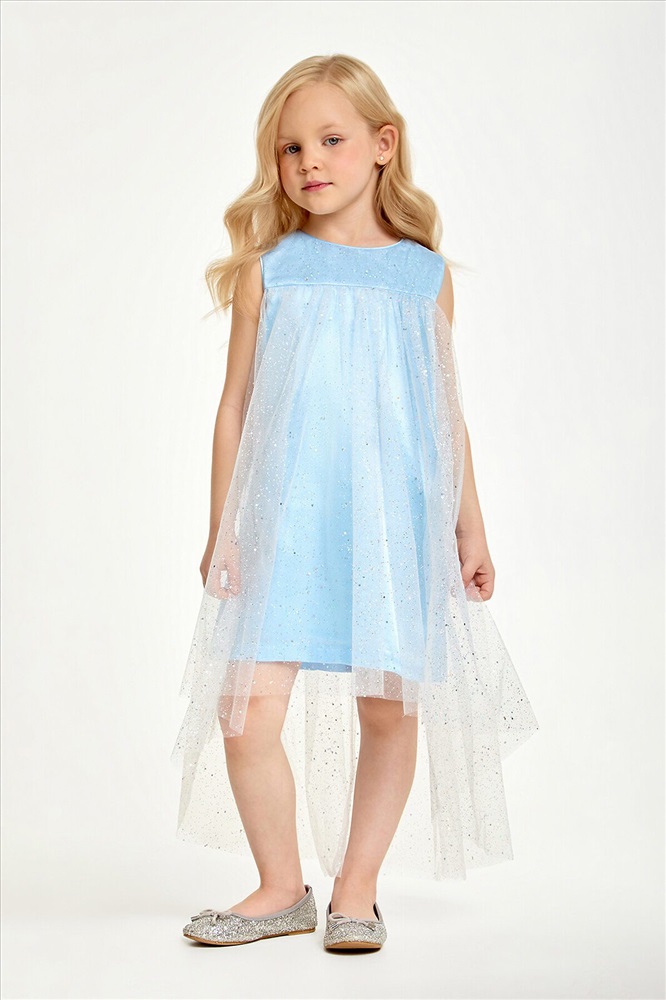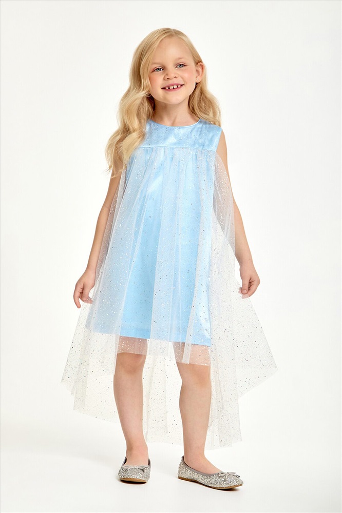 Нарядное платье А-силуэта с кокеткой на груди из гладкого атласа с подкладкой идеально подойдёт для особых случаев. Верх модели драпирован сеткой с блёстками, которая создаёт лёгкое сияние и праздничное настроение. Удлинённая спинка добавляет изысканности и подчёркивает элегантный силуэт.