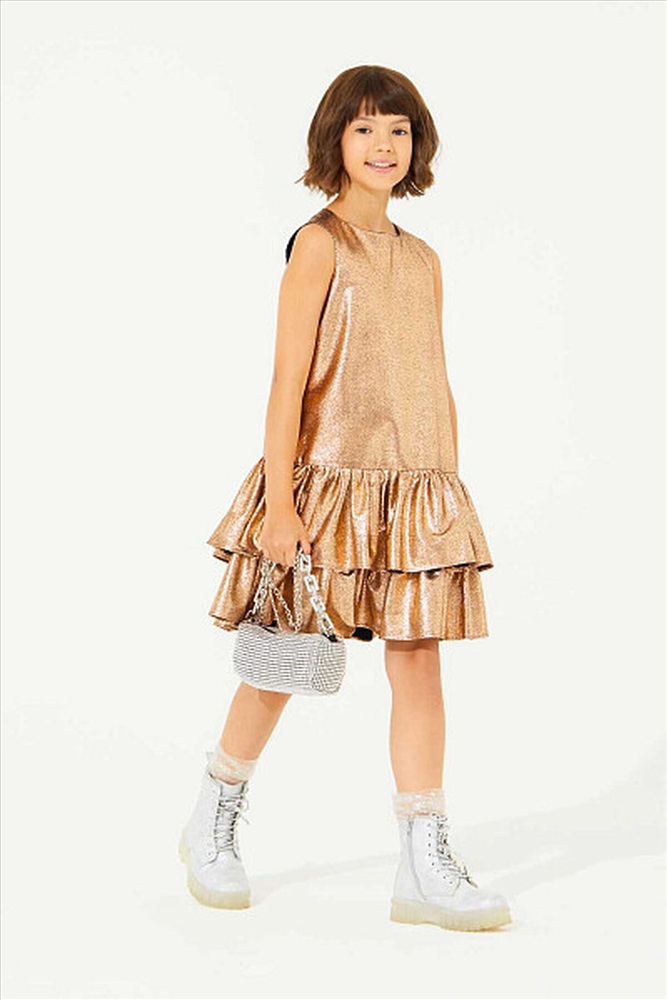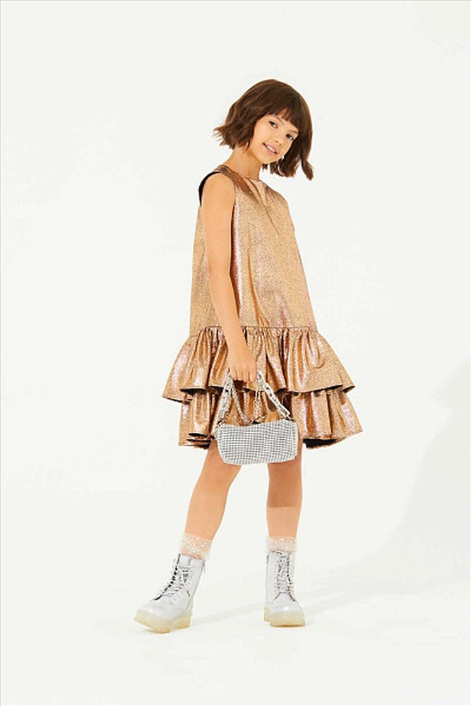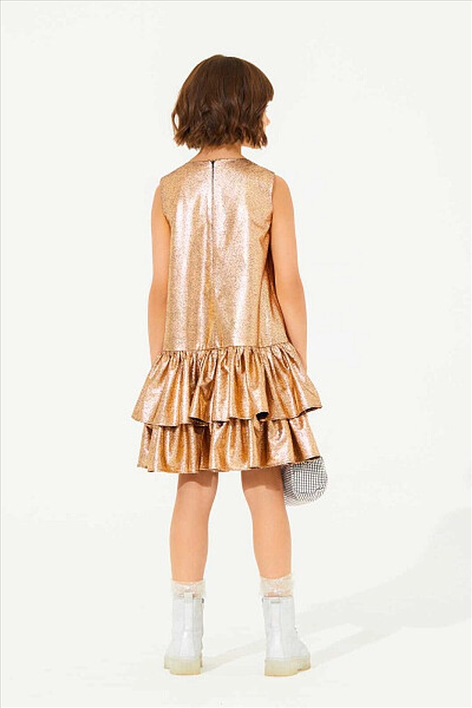 Стильное платье прямого силуэта, которое идеально подойдёт для новогоднего утренника. Верхний слой платья выполнен из блестящей ткани, а приятная к телу подкладка из хлопка обеспечивает комфорт и отводит влагу во время активных игр. У платья заниженная линия талии, по которой выполнена юбка из двух слоев пышных оборок. Застежка на потайную молнию по спинке обеспечивает легкость при надевании.