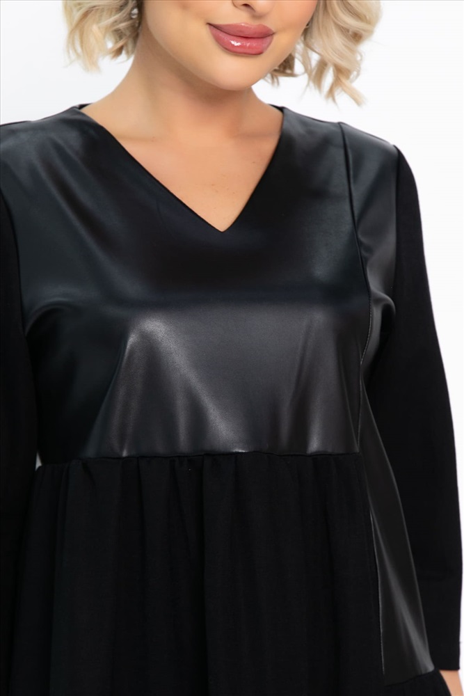 Платье в стиле «бохо» подходит для всех типов фигур, делая платье доступным и комфортным выбором для каждой женщины. Модель с V-образным вырезом горловины, рукава длиной три четверти, перед и спинка ассиметричные. Комбинирование экокожи трикотажным полотном придаёт изделию мягкости и уюта. А-образный силуэт обеспечивает свободу движений и удобство, делая это платье практичным выбором для ежедневного ношения.