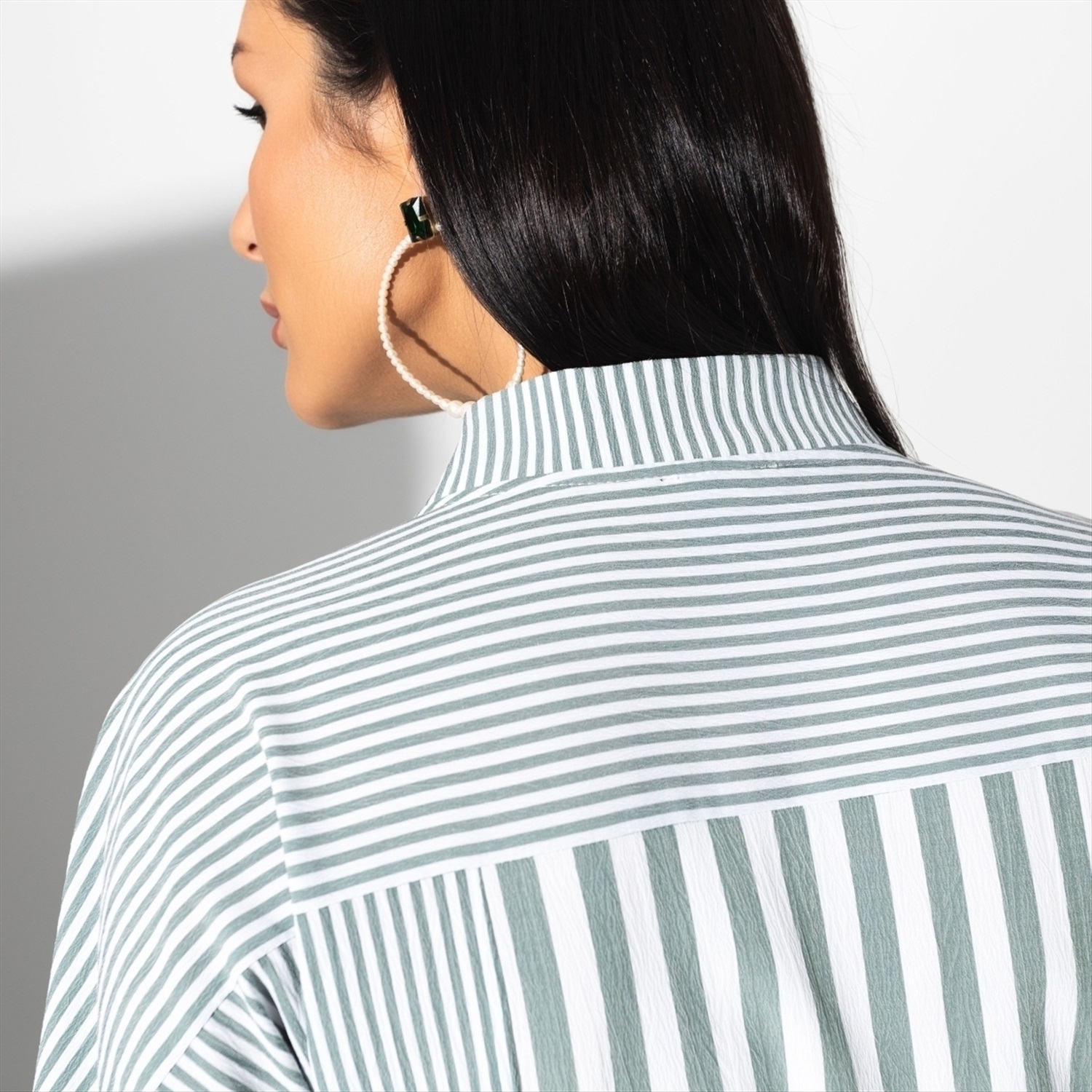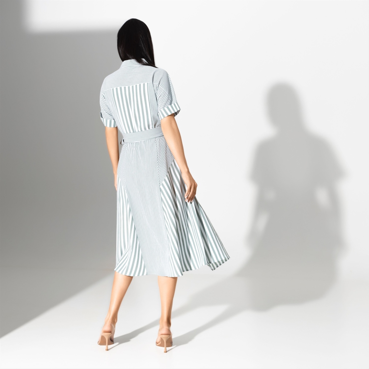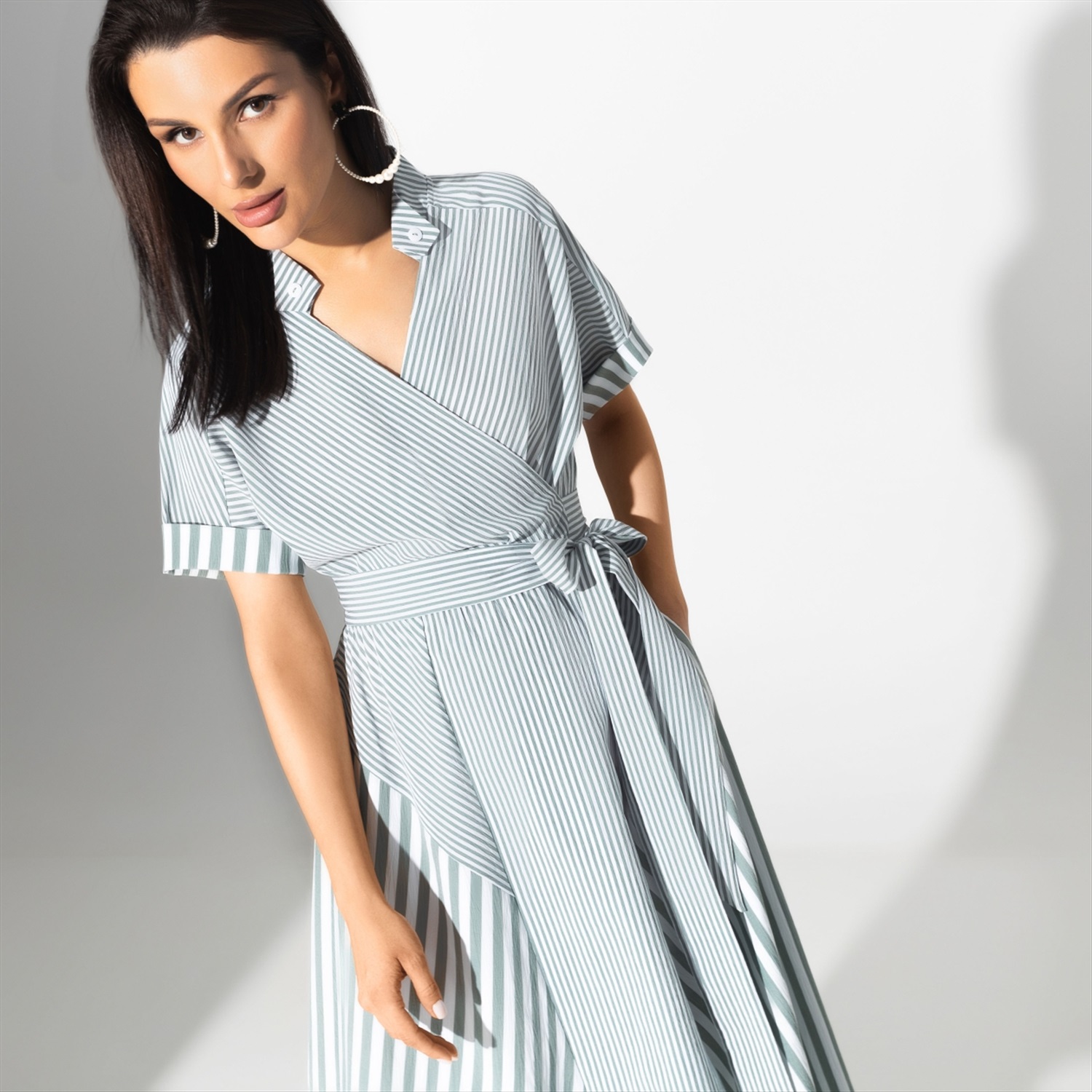 Трендовая вертикальная полоска – отсылка к морским прогулкам на роскошной яхте. Ассоциацию закрепляет лаконичный крой и ткань высочайшего качества.
