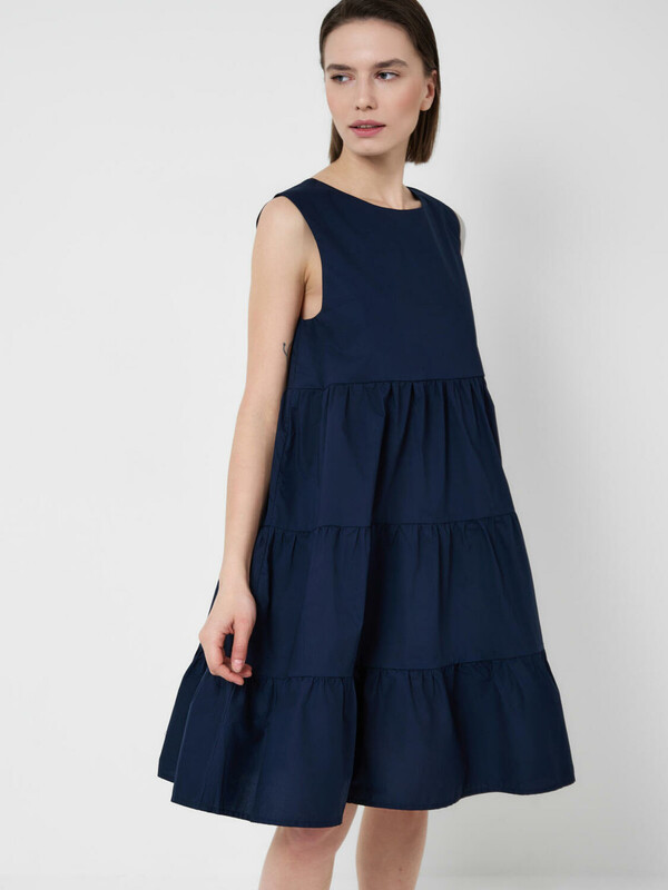 Женское платье свободного силуэта. Выполнено из лёгкой хлопковой ткани поплин. Модель в длине миди, состоит из присборенных блоков, за счёт чего юбка выглядит объёмной и летящей. Спереди — классический лаконичный вид, сзади — небольшая застёжка на пуговицу.