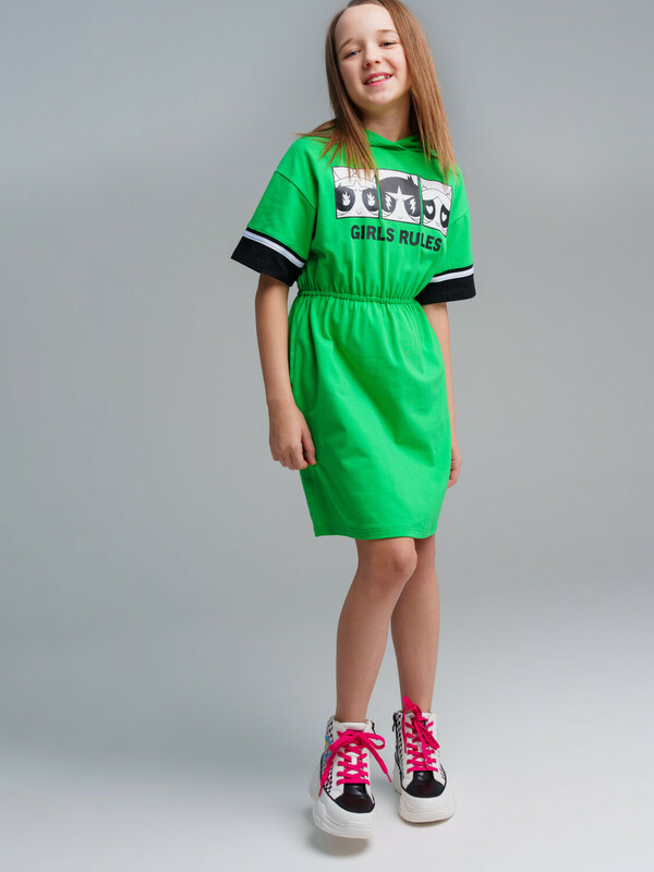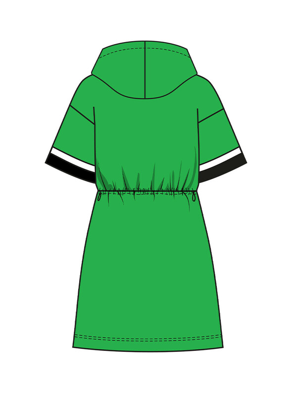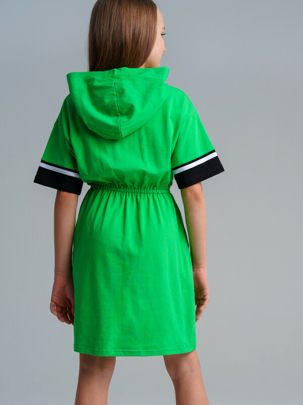 Платье с капюшоном из качественного и приятного на ощупь трикотажа джерси. Высокое содержание хлопка 95%. Благодаря наличию эластана в составе ткани изделие проще в уходе и держит форму. По талии эластичная резинка.