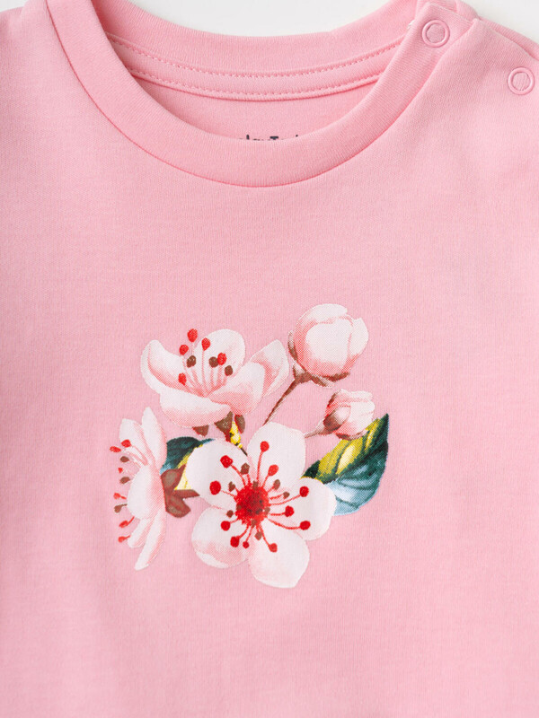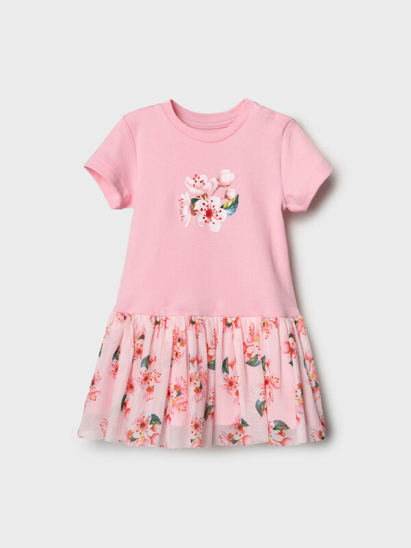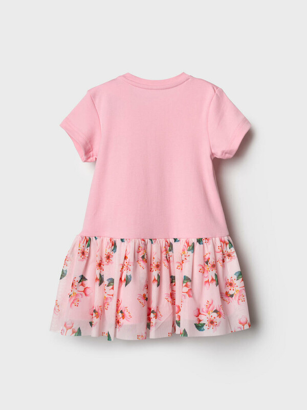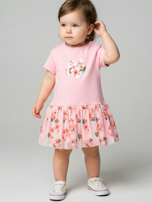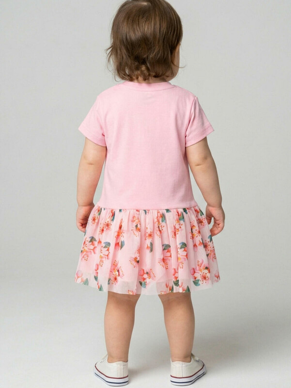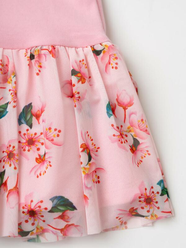 Нарядное детское платье для девочки. Модель из комбинации хлопкового трикотажа интерлок и сетки. Верх выполнен в виде футболки в нежно-розовом цвете и украшен ярким цветочным принтом на груди. Пышная юбка с цветочным рисунком собрана по талии и придаёт изделию нарядный вид. На плече — кнопки, чтобы платье было удобно надевать через голову.