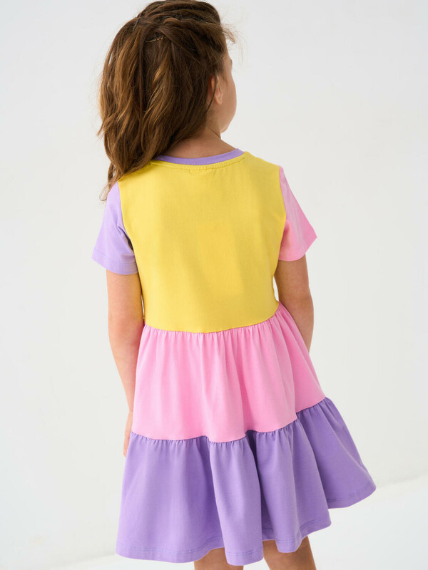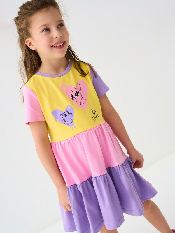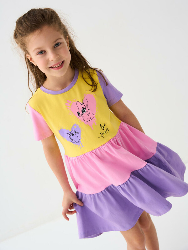 Детское лёгкое платье для девочки. Выполнено из мягкого хлопкового трикотажа джерси. Юбка двухъярусная с оборками. На груди — милый принт с изображением зайчика и котёнка в сердцах. Платье длиной выше колена, с удобной круглой горловиной.