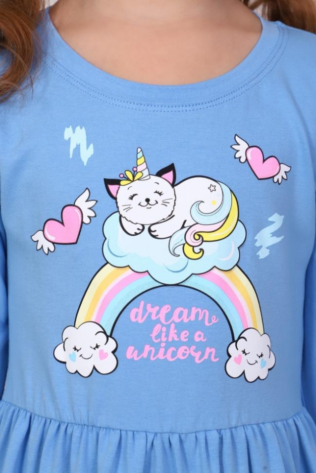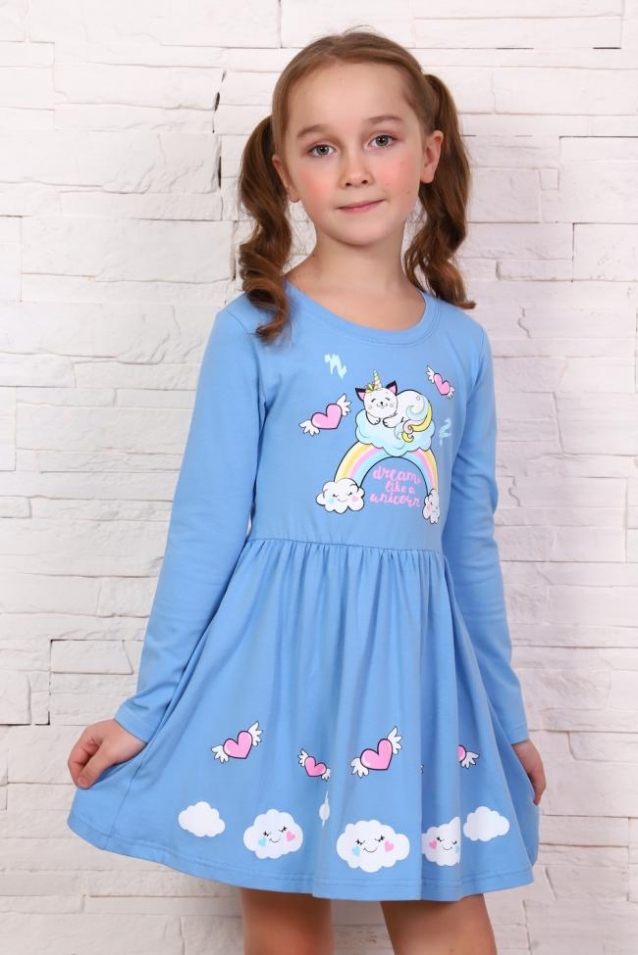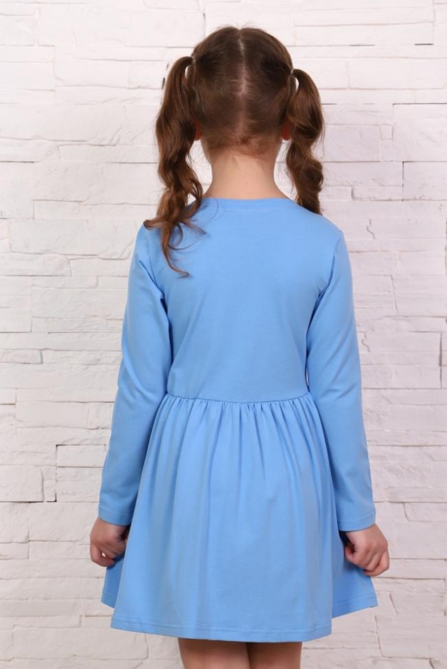 Платье для девочек дошкольного и младшего школьного возраста, из однотонного трикотажного полотна кулирка с лайкрой. Платье прилегающего силуэта, отрезное и расклешенное от линии талии, с втачным длинным одношовным рукавом, с обтачкой в горловине. Низа рукавов и нижней части платья подогнуты. По шву втачивания обтачки в горловину проложена отделочная строчка. Спереди на верхней и нижней частях платья нанесен печатный рисунок.
