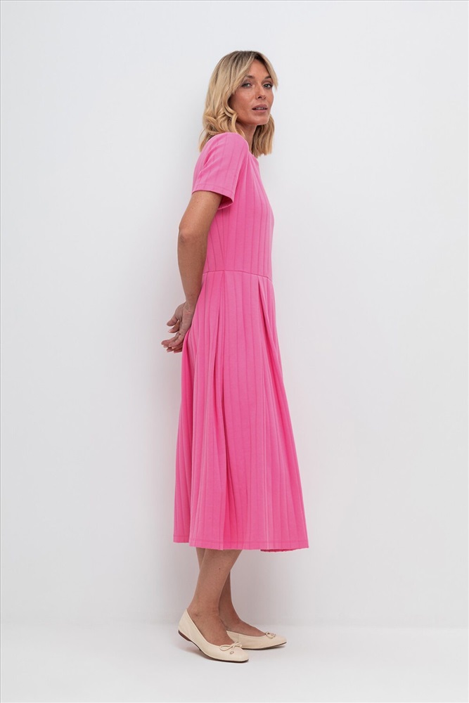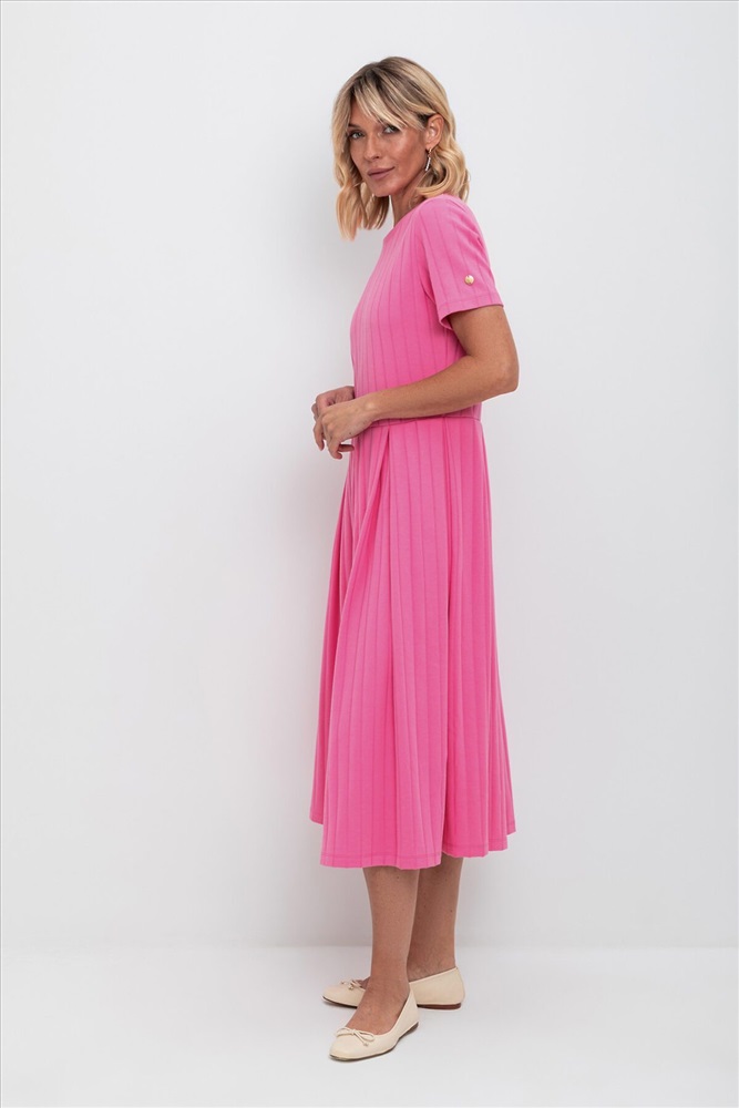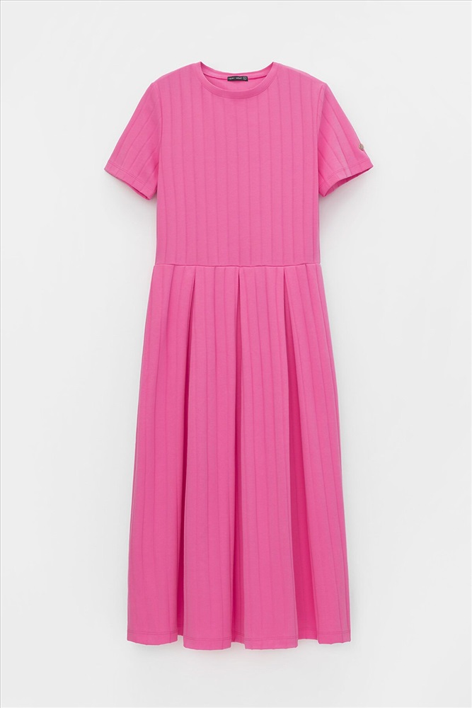 Платье в складку с круглым вырезом и короткими рукавами из плотного гладкого трикотажа интерлок в рубчик. Все трикотажные полотна производятся в соответствии с нормами Швейцарского сертификата ЭкоТекс. Сделано в России - 100% хлопок - гипоаллергенные красители
