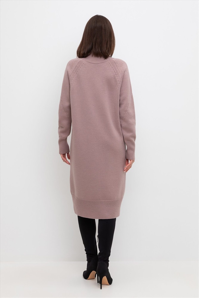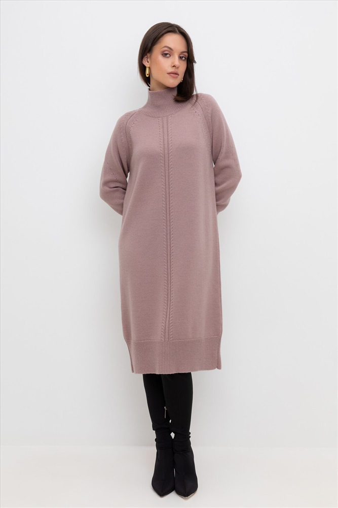 Вязаное платье длины миди с длинными рукавами с рукавами реглан из полушерсти. Выполнено гладью. Прямой силуэт хорошо садится по фигуре. Манжеты и низ изделия вывязаны широкой резинкой, благодаря которой края не растягиваются. Все вязаные изделия проходят дополнительную влажно-тепловую обработку по итальянской технологии, что гарантирует минимальную усадку во время носки. Сделано в России
