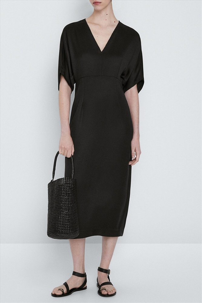 Платье с глубоким V-вырезом и рукавом «летучая мышь» выполнено из тончайших нитей плотного сатина, плетение которых создает полуматовый блеск, напоминающий натуральный шёлк. Модель с длинными глубокими вытачками спереди и сзади выглядит скульптурно, но за счет струящейся ткани сохраняется плавность силуэта. Ткань почти не мнется и имеет легкий вес. Комфортная длина ниже колена и застежка на молнию. ВНИМАНИЕ!!! При выборе размера опирайтесь на фотографию с замерами изделия и таблицу размеров!
