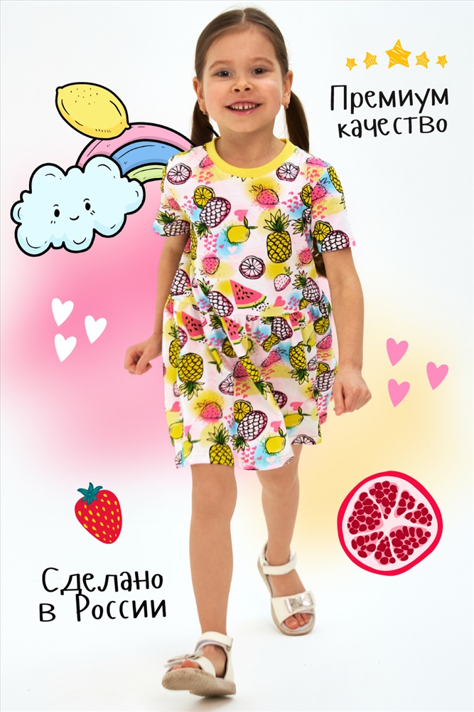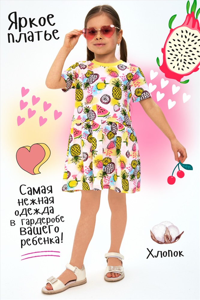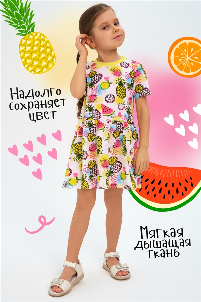 Состав: 100% хлопок Модель: Платье Витаминка кор.рукав Тип товара: платье Бренд: Детский трикотаж 37 Длина: средняя длина Карман: без карманов Материал: кулирка Рисунок: фуд-принт Рукав: короткий рукав Сезонность: лето | осень | весна | зима Силуэт: расклешенный Стиль: повседневный Воротник: без воротника Застежка: без застежки Детское платье для юных модниц в сочных, ярких и насыщенных тонах. Привлекательный принт, современный крой. 100% хлопок. Таблица размеров и веса