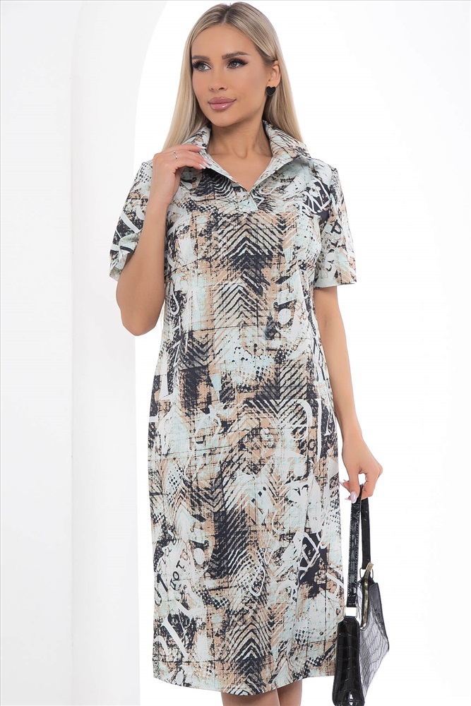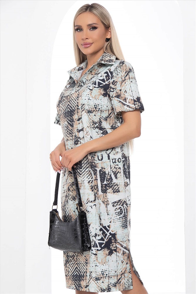 Великолепная модель платья прямого силуэта в трех цветах с оригинальным принтом. Необычный рубашечный воротник на высокой стойке придает платью особый статус. Планка в стиле «поло» делает изделие особенно элегантным. Платье актуальной средней длины с разрезами по бокам. Рукав короткий, прямой. Завершает образ красивый длинный пояс.
