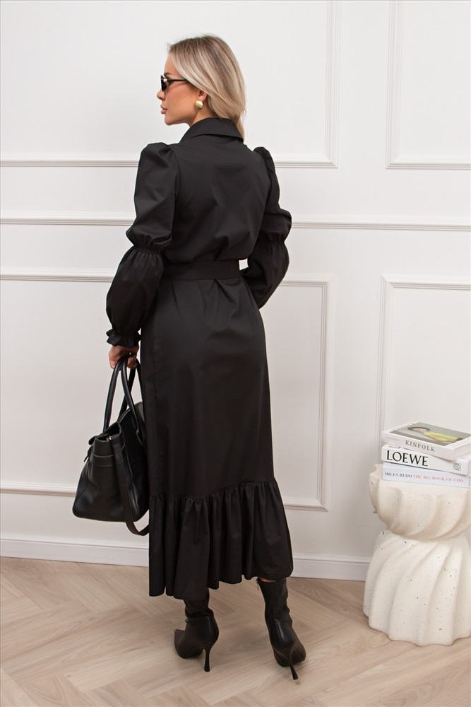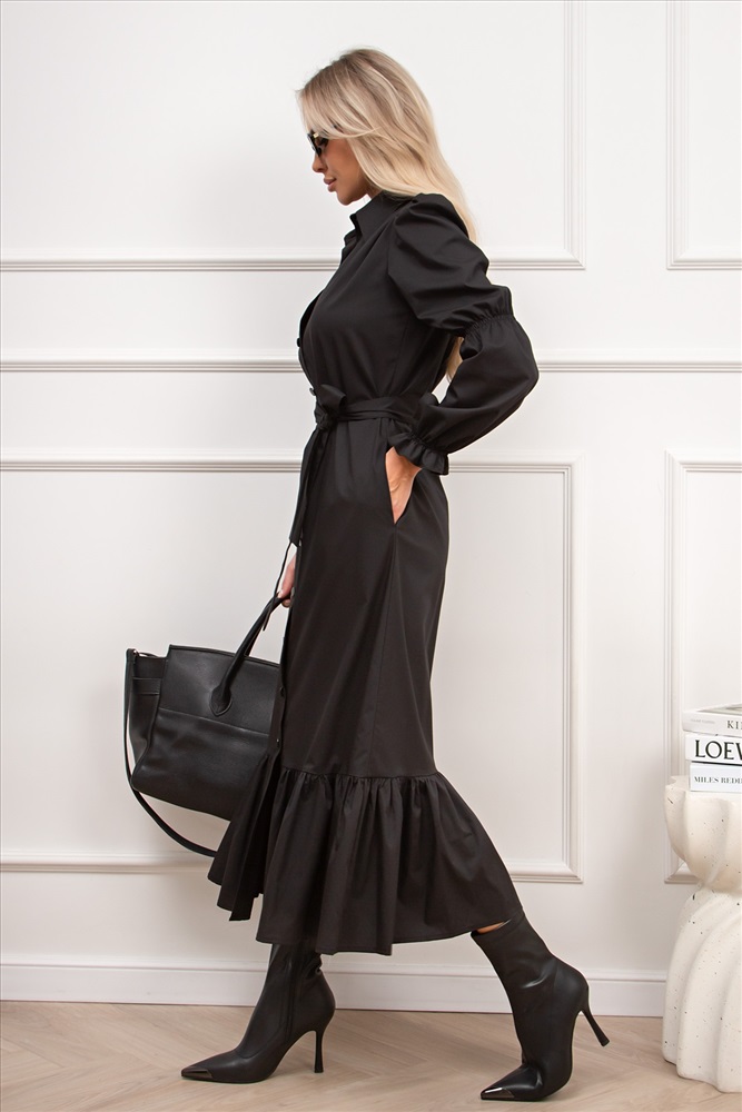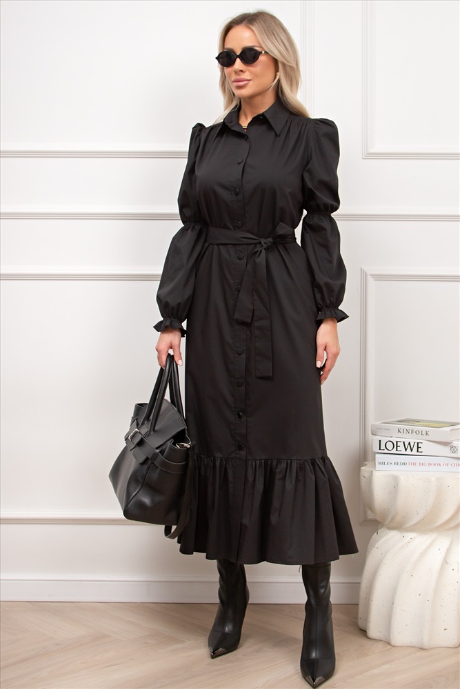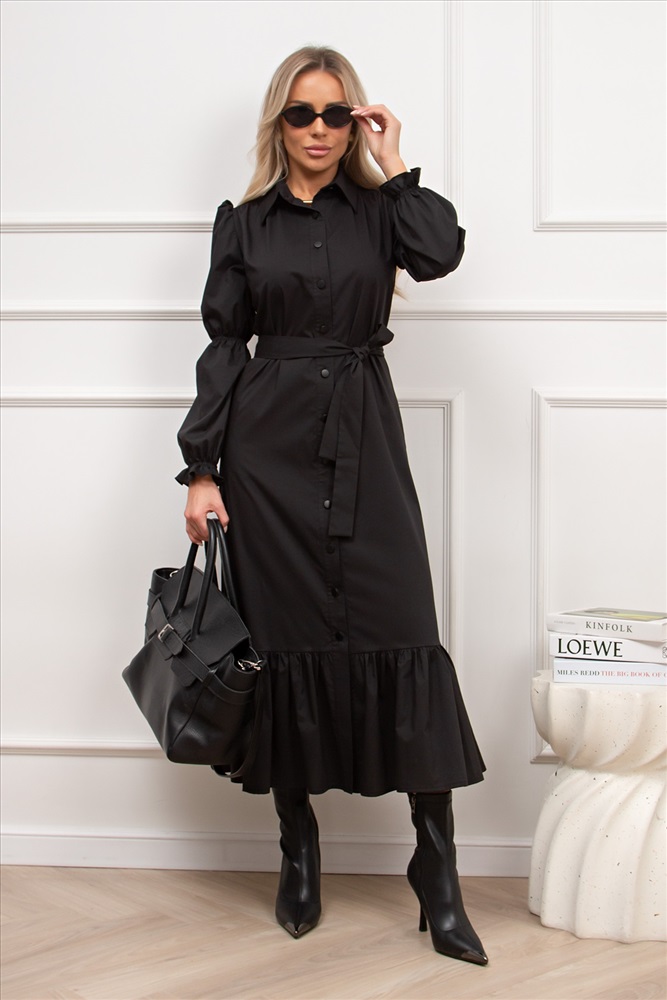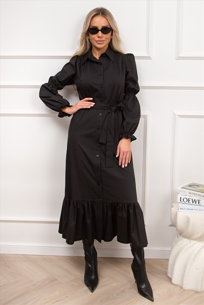 Женственное платье прямого силуэта. Горловина оформлена отложным воротником на стойке. По переду планка с застежкой на петли и пуговицы. Длинный втачной рукав со сборкой по окату, по низу присборен на шпульную резинку. В боковых швах функциональные карманы. Низ оформлен притачным воланом. Пояс из основной ткани в комплекте.