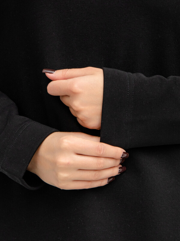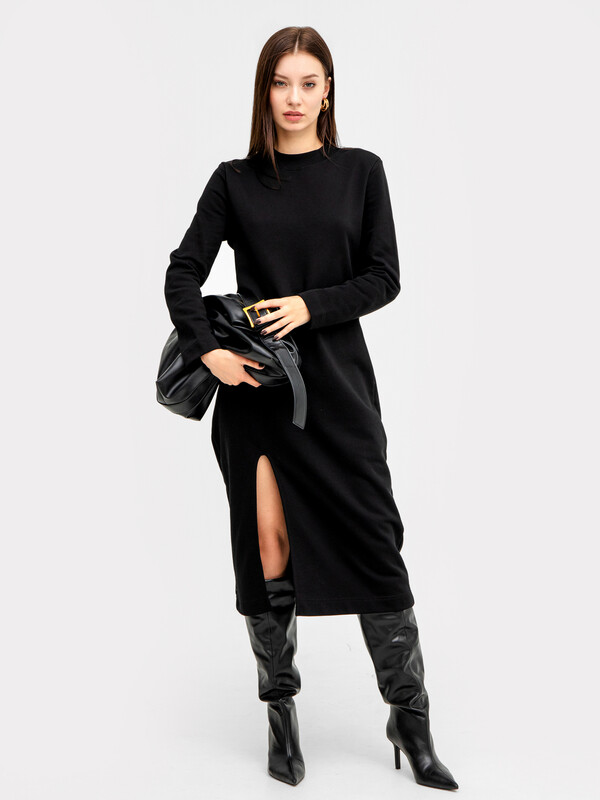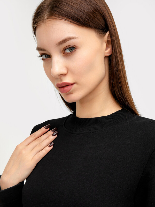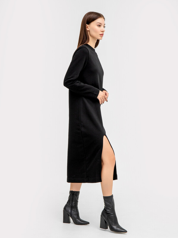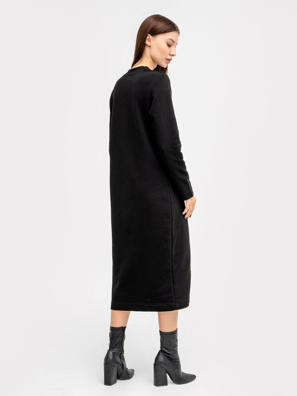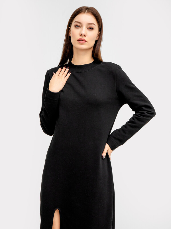 Горловина круглой формы, обтачка горловины широкая из трикотажного полотна рибана. Рукав втачной, длинный. На передней детали по низу декоративный вырез обработан бейкой из трикотажного кулирного полотна. Платье длинной ниже колена. 87% хлопок; 13% полиэстер Комментарии к товару