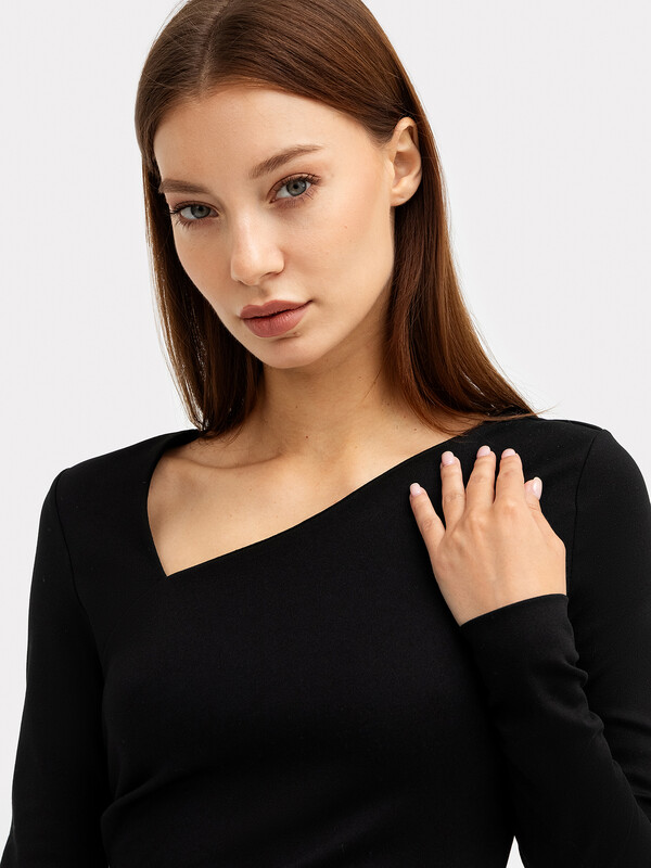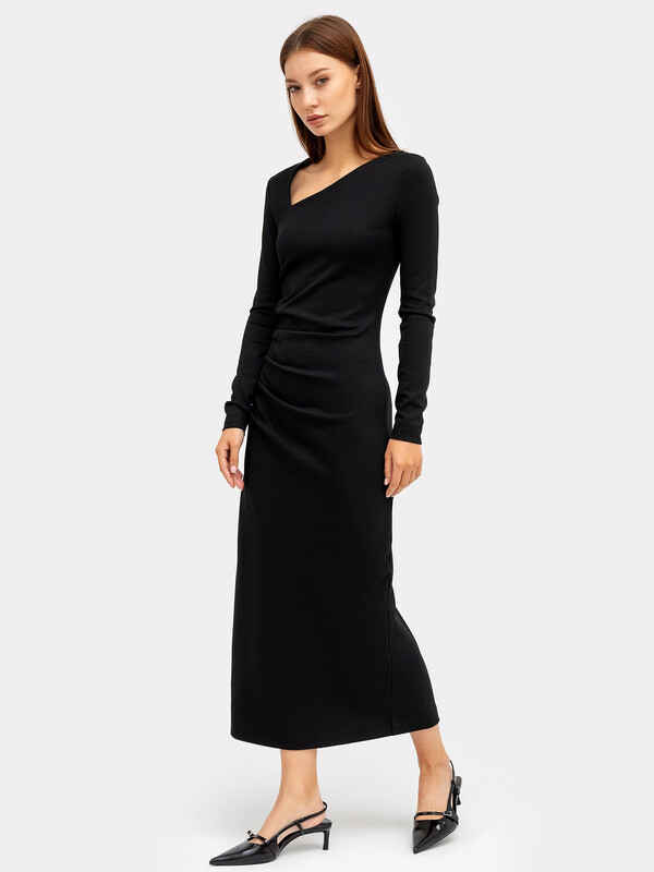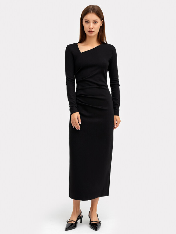 Вырез горловины асимметричный, обработан обтачкой из основного полотна. В правом боковом шве заложены складки которые драпируются на детали переда. Спинка с центральным швом в котором обработана застежка на потайную молнию и разрез. Рукав втачной, длинный. Платье длиной ниже колена. 75% вискоза; 20% полиэстер; 5% эластан Комментарии к товару