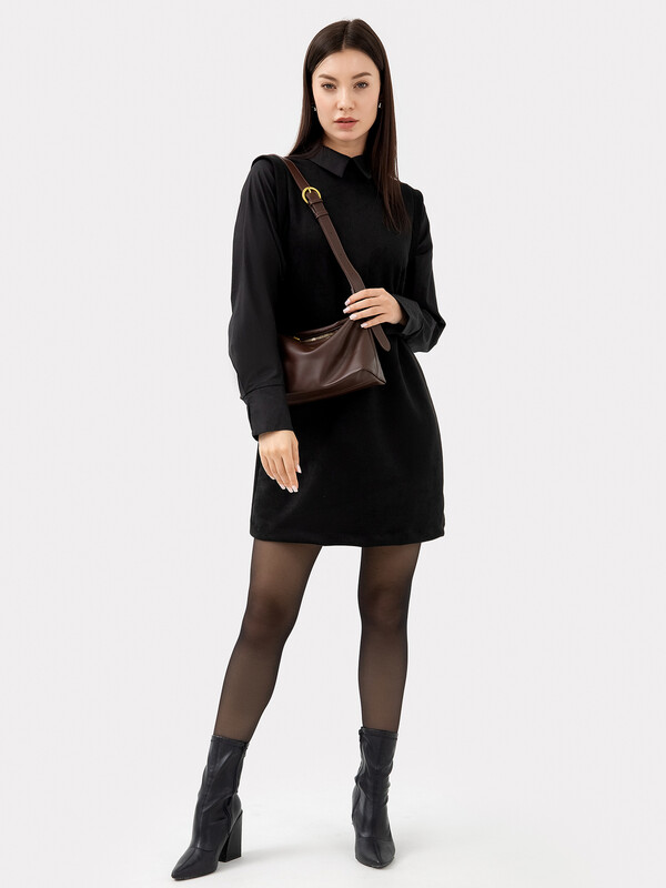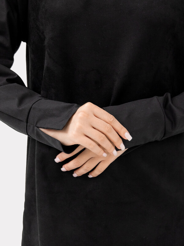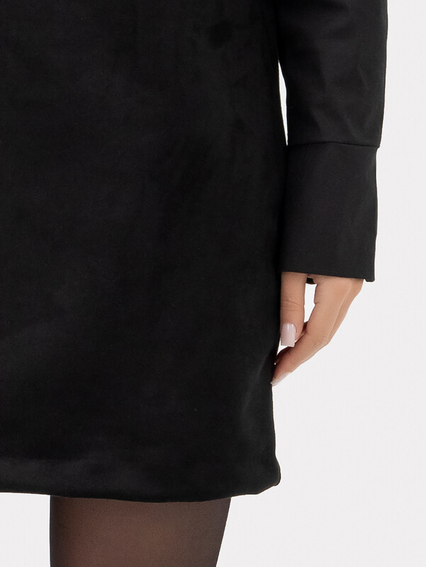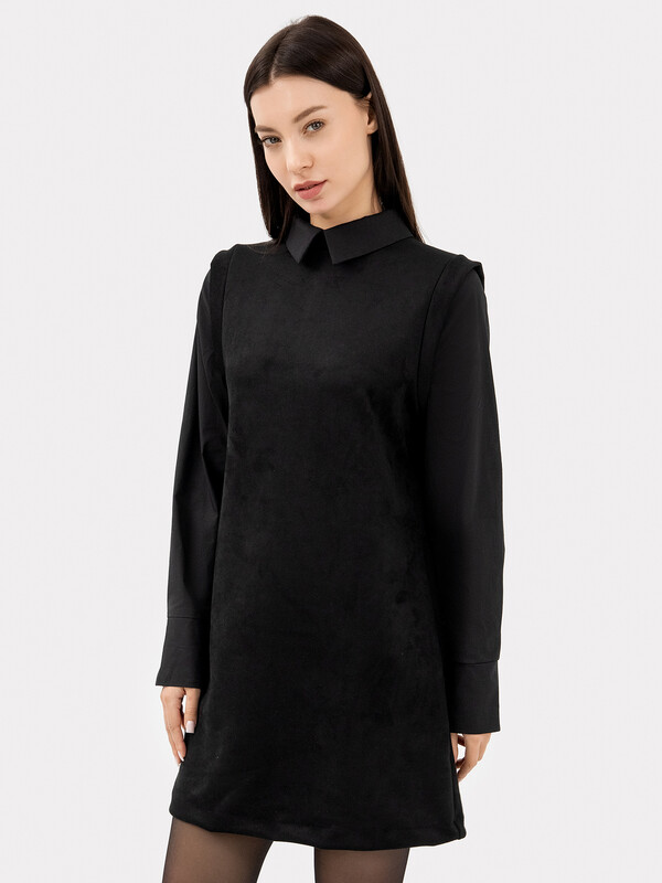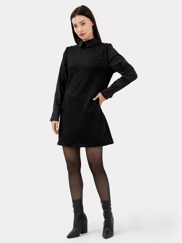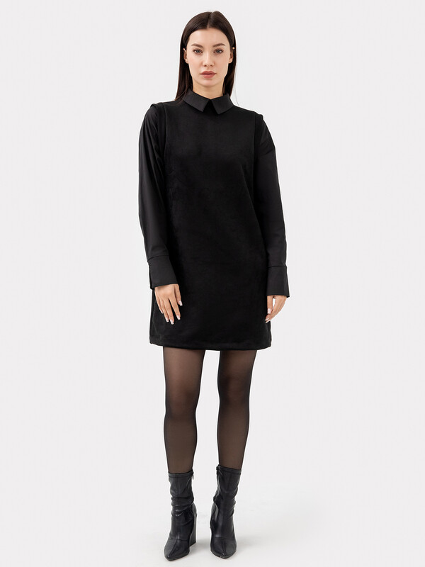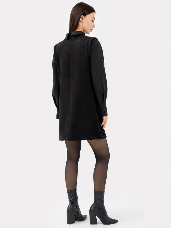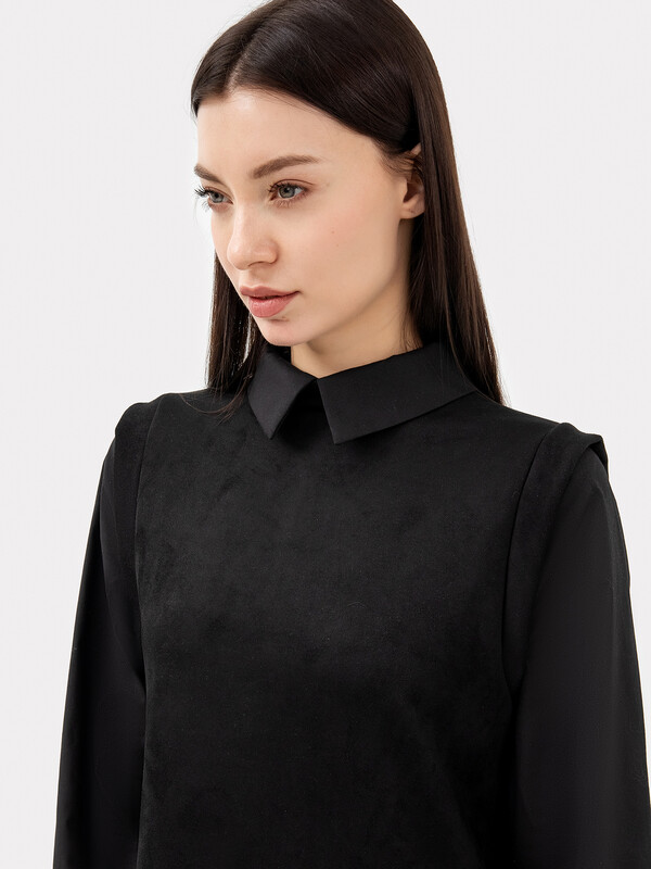 Платье женское А-силуэта из трикотажного полотна "под замшу" и ткани. Горловина круглой формы, со стойкой из трикотажного полотна "под замшу". К стойке притачивается воротник из ткани. На детали спинки в средний шов обработана застежка на потайную молнию.