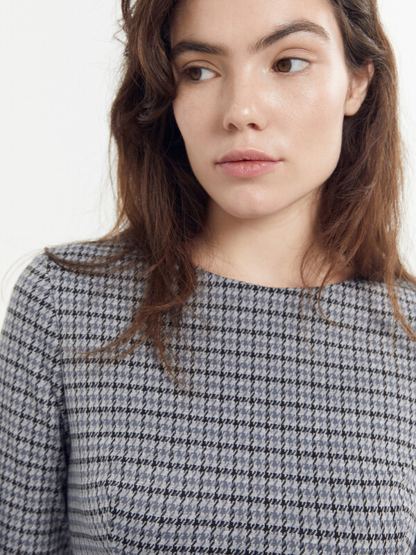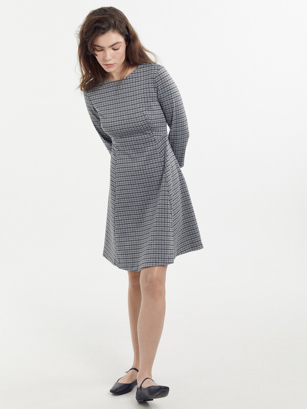Платье длиной выше колена. Подгибка низа и рукава сделана потайным стежком.