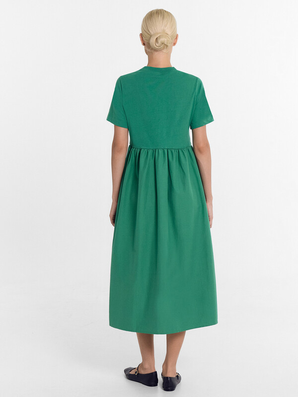 Горловина круглой формы, обтачка горловины из рибаны. Шов горловины спинки закрыт бейкой из кулирки. По горловине проложена отделочная строчка. Плечо слегка спущено, пройма углублена. Рукав втачной, короткий. Платье отрезное по талии, низ платья из ткани присборен и к низу расширяется. Платье длиной миди. 84% хлопок; 16% полиэстер Комментарии к товару