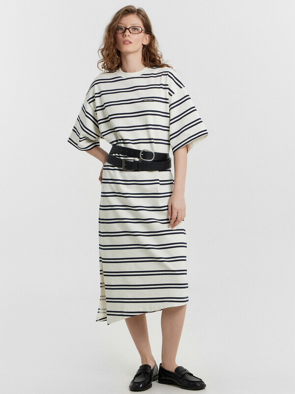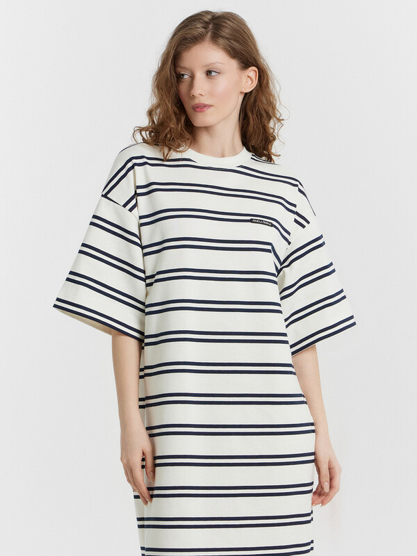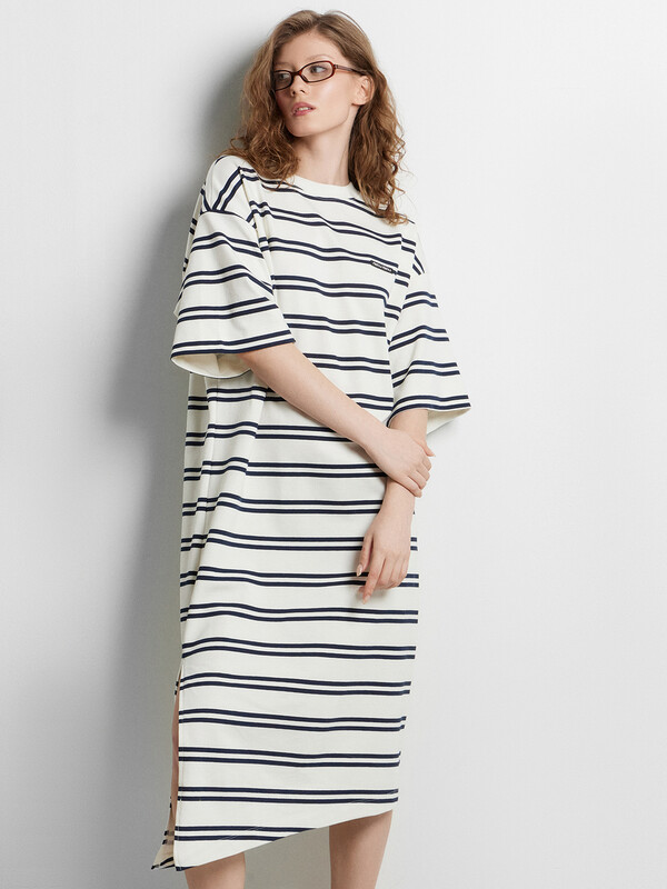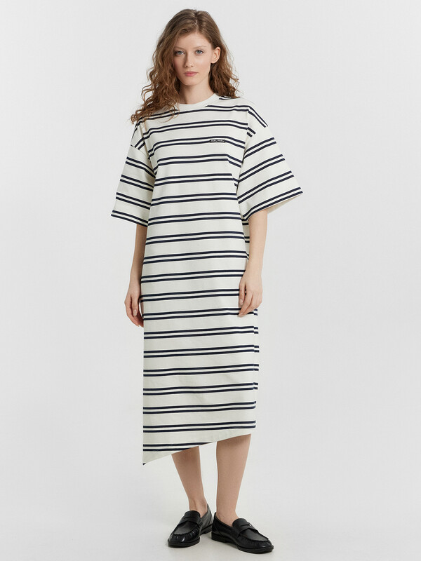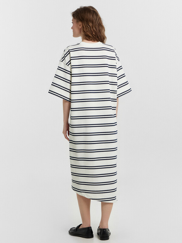 Горловина круглой формы, обтачка горловины из рибаны. Плечо спущено, пройма углублена. Рукав втачной, короткий, широкий, длиной по локоть. В правом боковом шве обработан разрез. Низ платья асимметричный. Длина миди. 100% хлопок Комментарии к товару