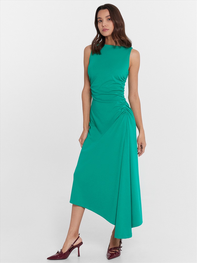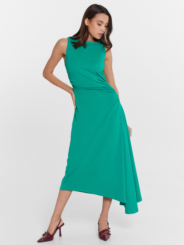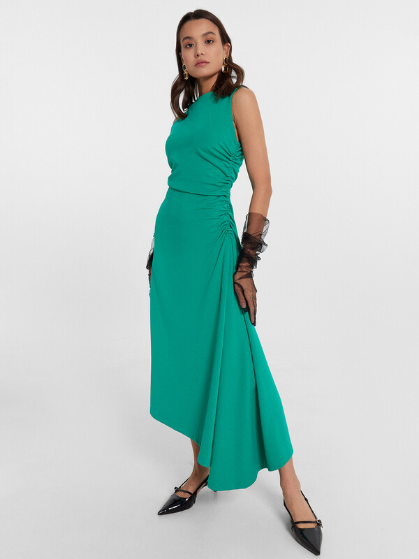 Платье асимметричное. В правом боковом шве сборка на верхней части.