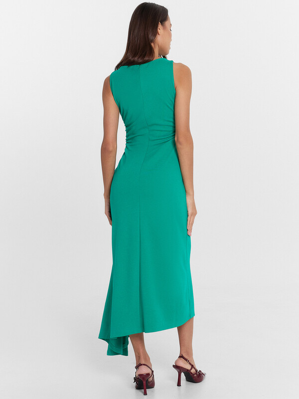 Низ платья асимметричный. Длина ниже колена.