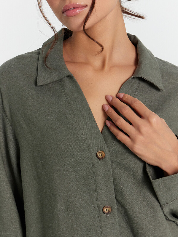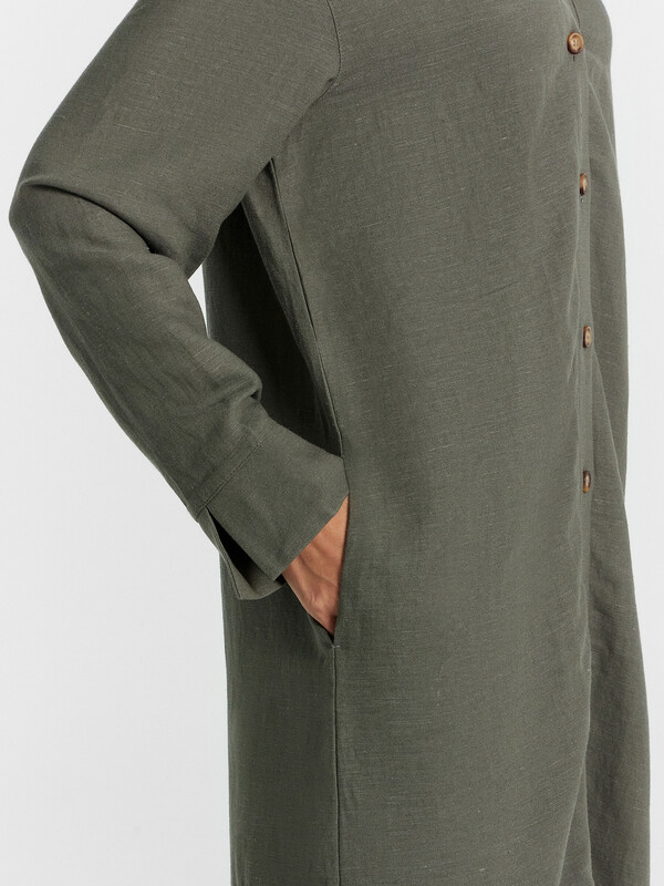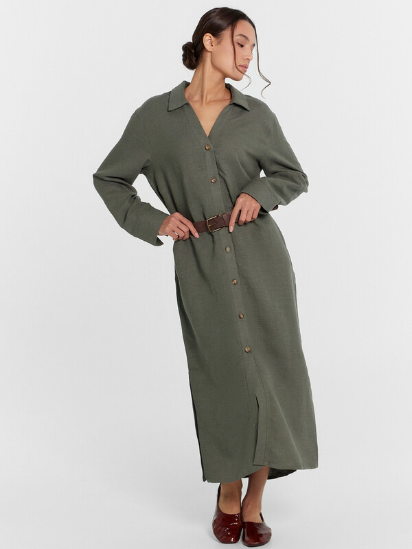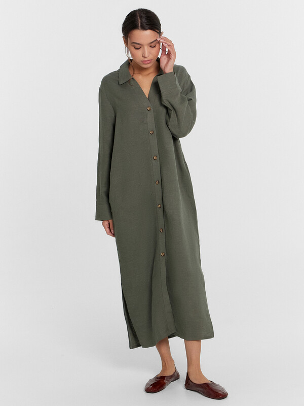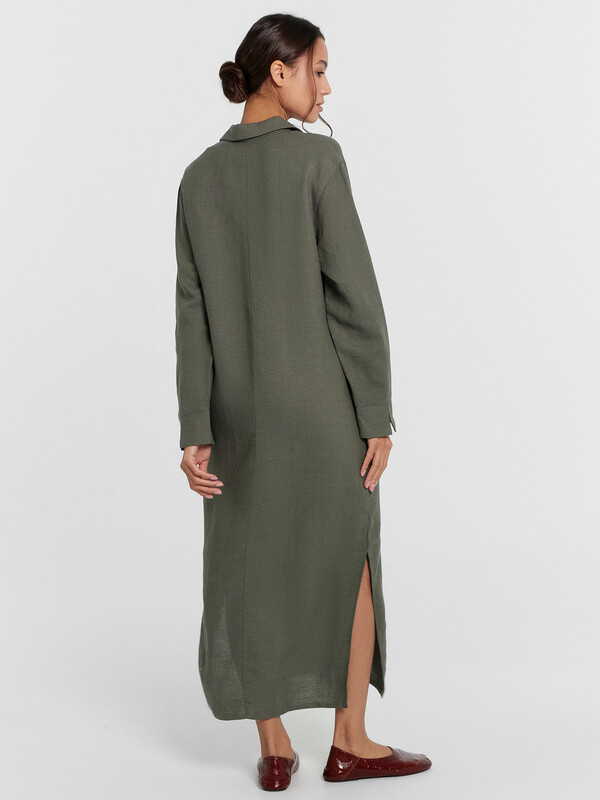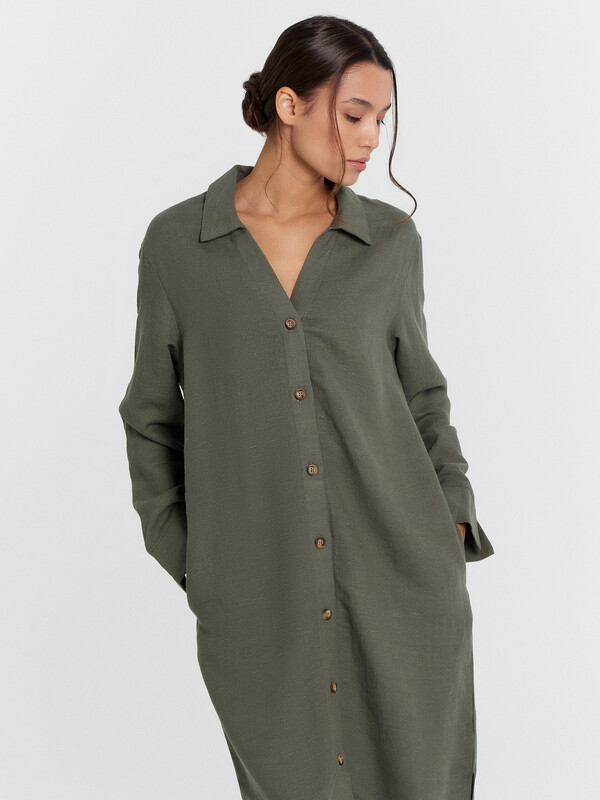 Платье прямое свободное, длиной миди. Горловина V-образной формы со стояче-отложным воротником. Плечо слегка спущено, рукав втачной, длинный. По низу рукавов отрезные манжеты с разрезами. Центральная застежка на петли и пуговицы. В боковых швах обработаны карманы. По бокам внизу обработаны разрезы. Нижний срез платья обработан швом вподгибку с закрытым срезом.