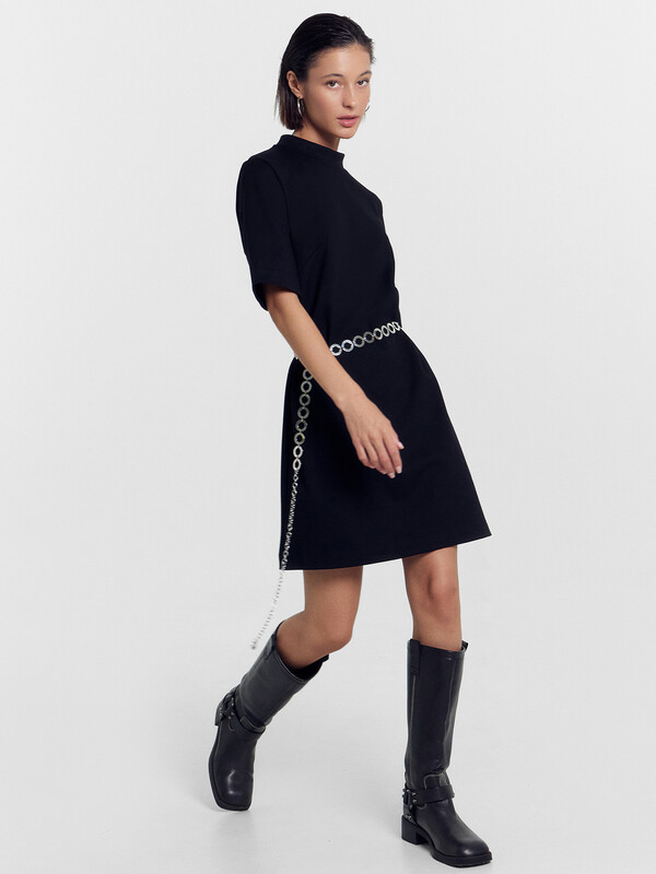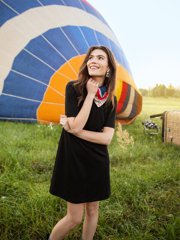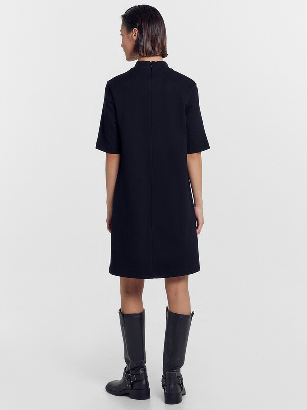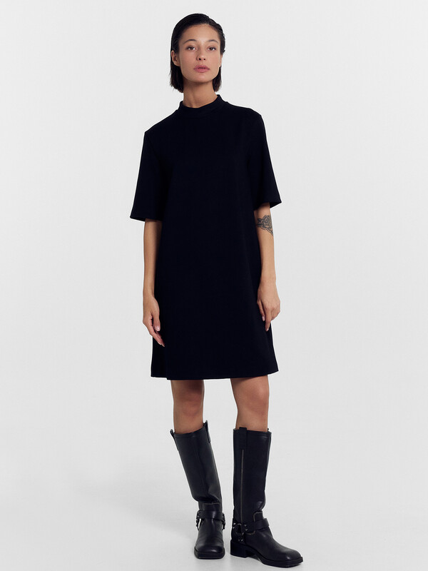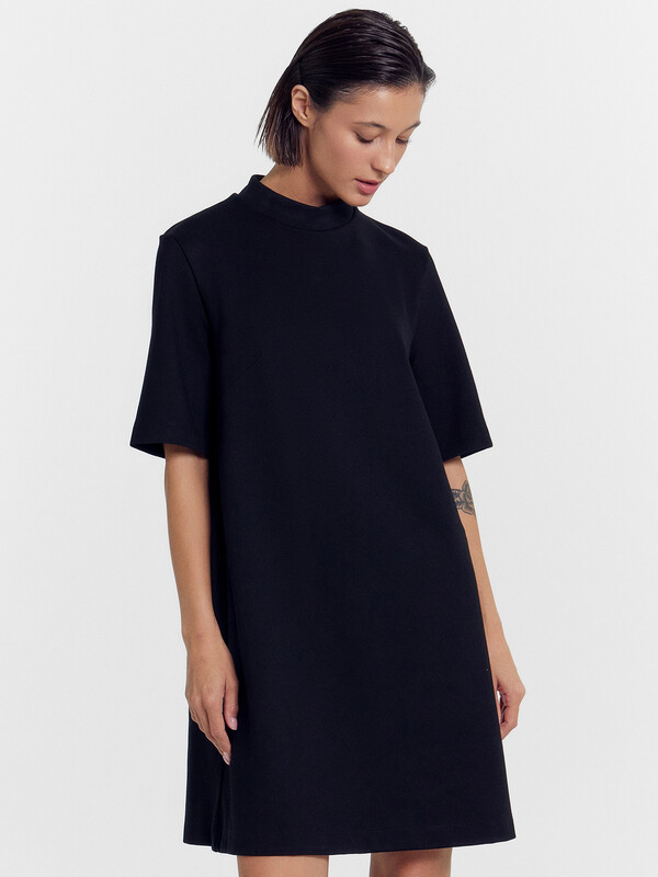 Платье А-силуэта. Горловина круглой формы с воротником стойкой. Плечо слегка спущено, рукав втачной, короткий. На детали переда вытачки. Спинка со средним швом и застежкой на потайную молнию. Нижний срез платья и рукавов обработан швом вподгибку на 2х игольной плоскошовной машине.