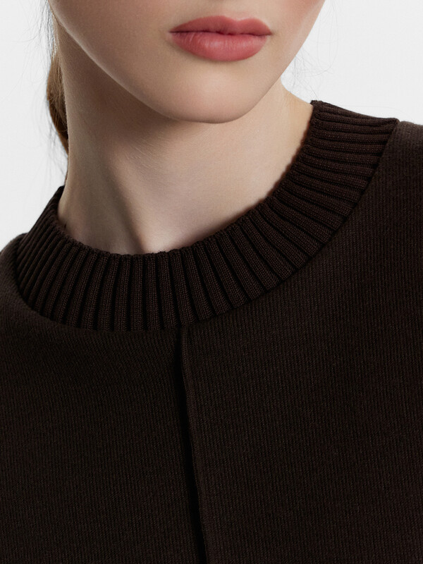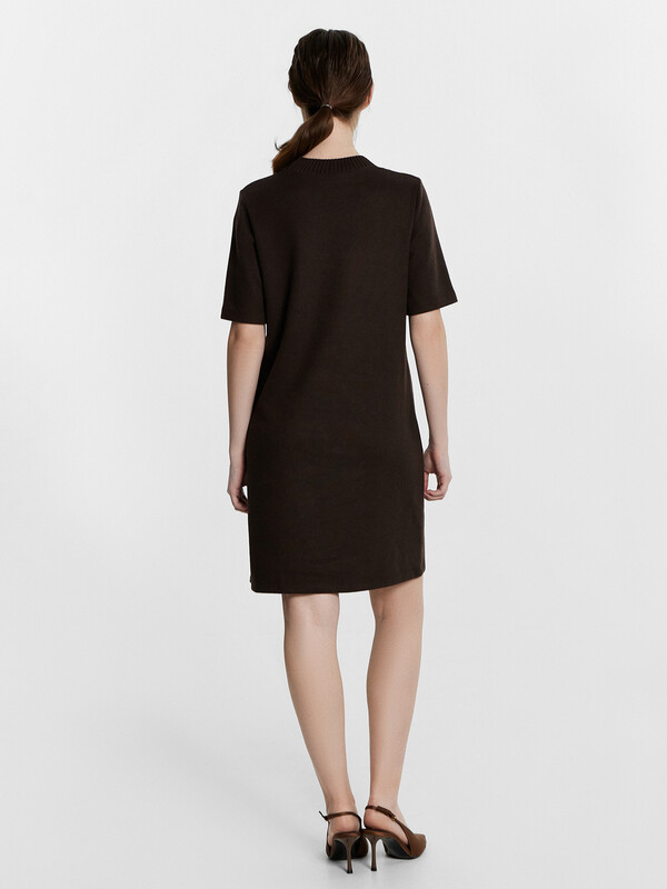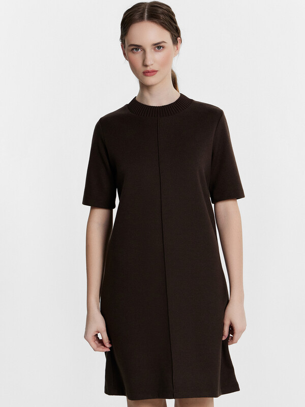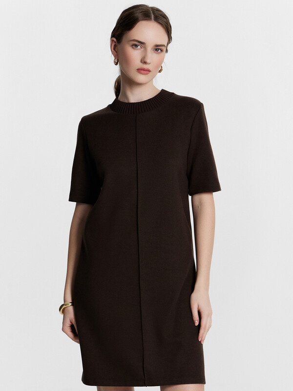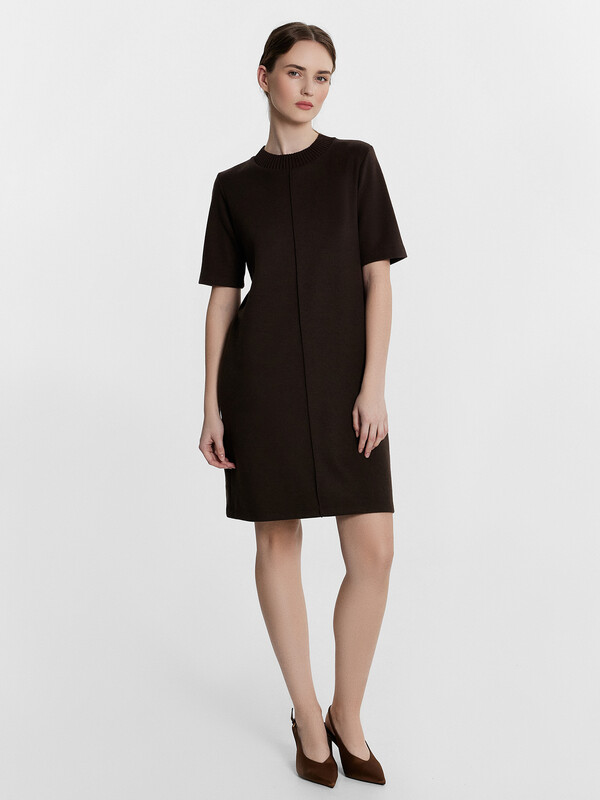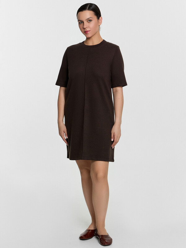 Платье А-силуэта длины мини станет прекрасным выбором для стильного и элегантного образа. Круглая горловина и короткие рукава придают ему классический вид, а передний шов добавляет уникальный акцент. Материал селаник делает это платье особенно мягким и уютным, что идеально подходит для прохладных дней. Этот универсальный и стильный элемент гардероба легко сочетается с различными аксессуарами, создавая разнообразные образы для любого случая.