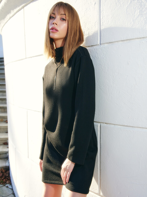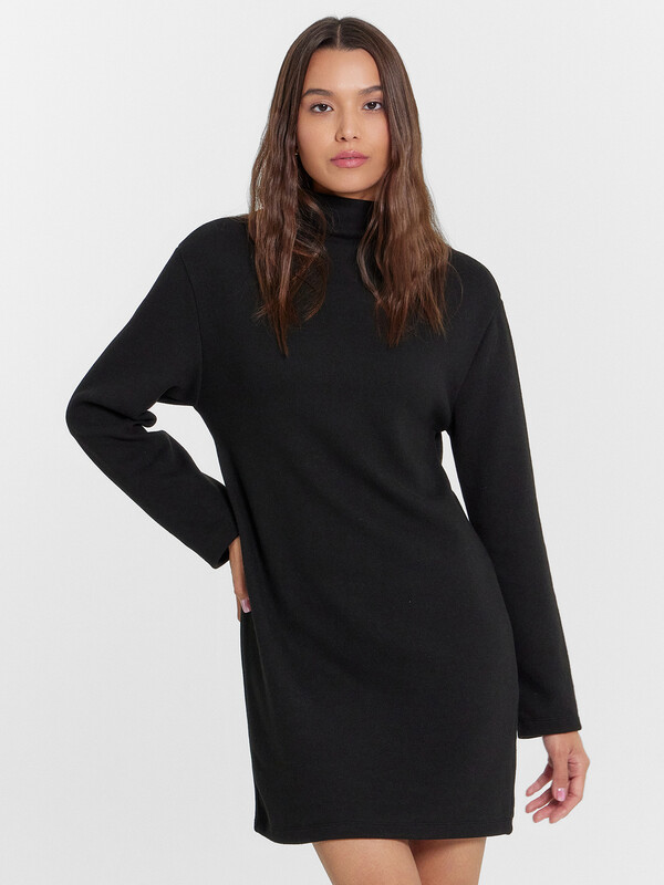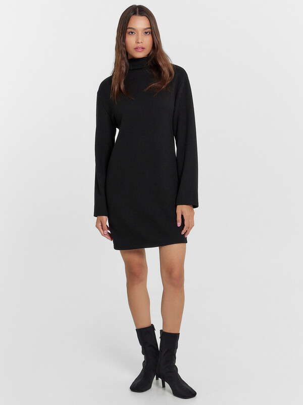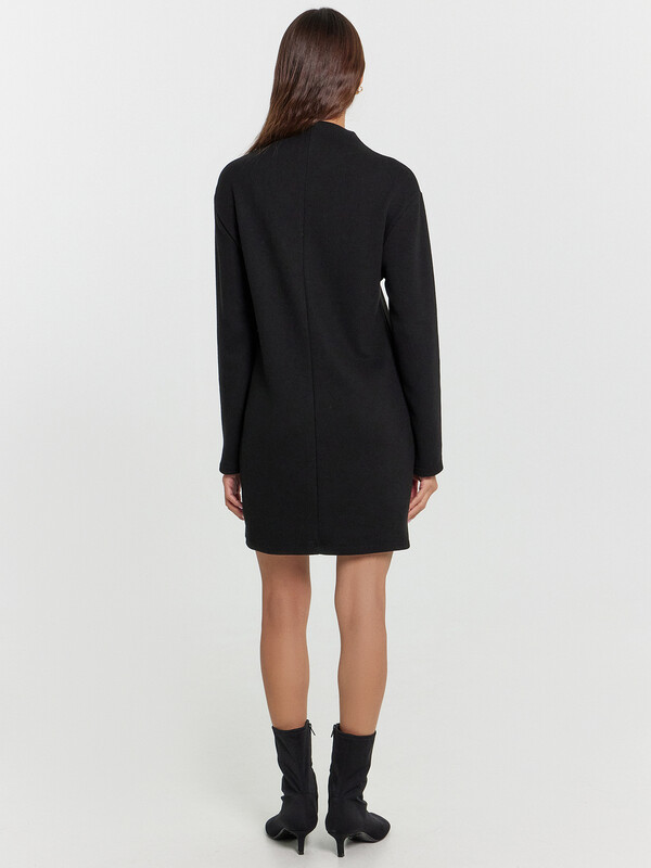 Платье прямое, свободное. Длина мини. Горловина с цельнокроеной стойкой. Рукава втачные длинные. Плечо спущено. Спинка со средним швом. Нижние срезы обработан швом вподгибку.