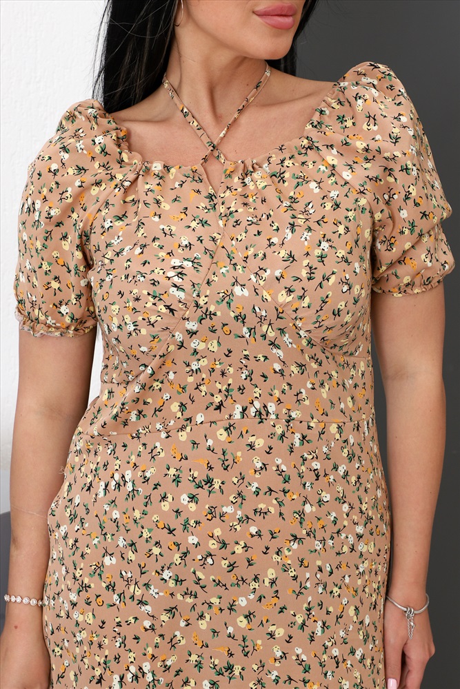 Платье женское полуприталенного силуэта, короткий рукав, округлая горловина с декоративными завязками, на передней полочке разрез снизу. Вид застежки скрытая молния сбоку. Легкое и удобное.