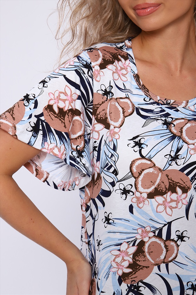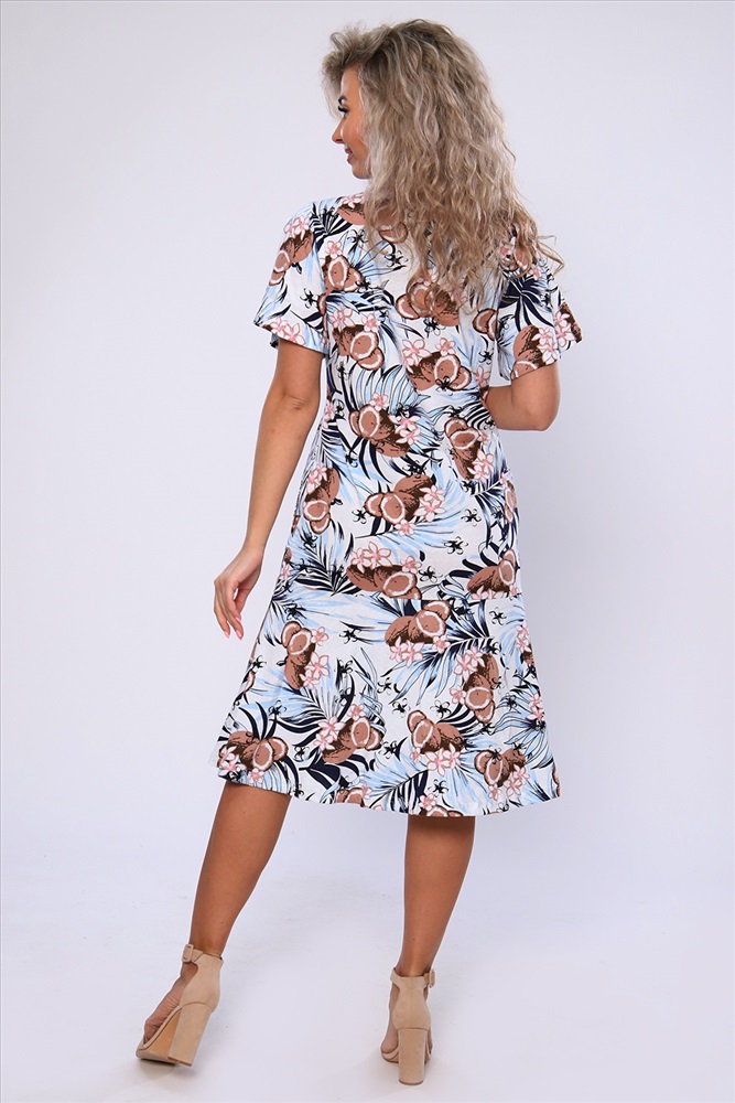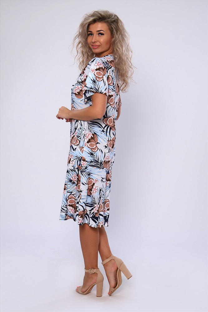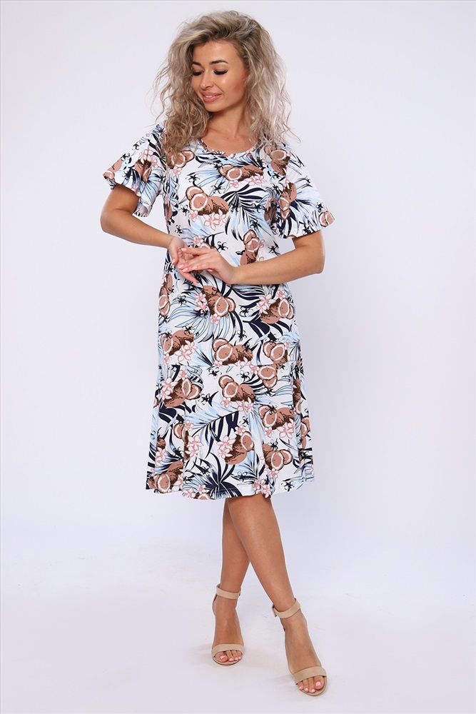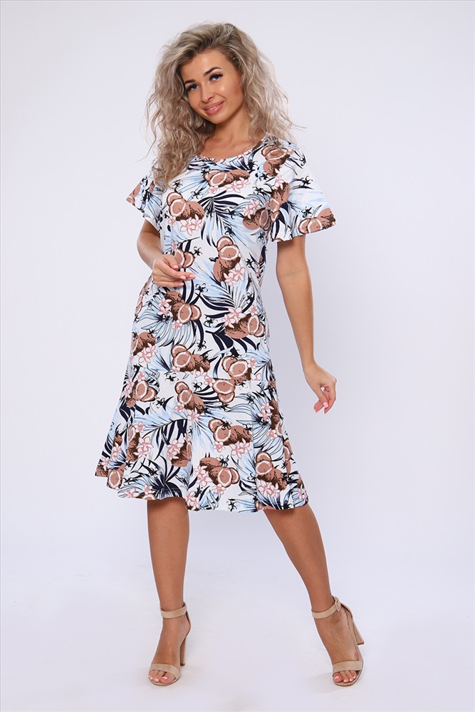 Платье полуприлегающего силуэта с короткими расклешенными рукавами. По низу платья притачные воланы. Необходимый элемент гардероба для легких образов.