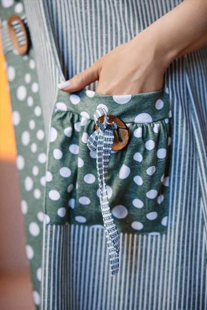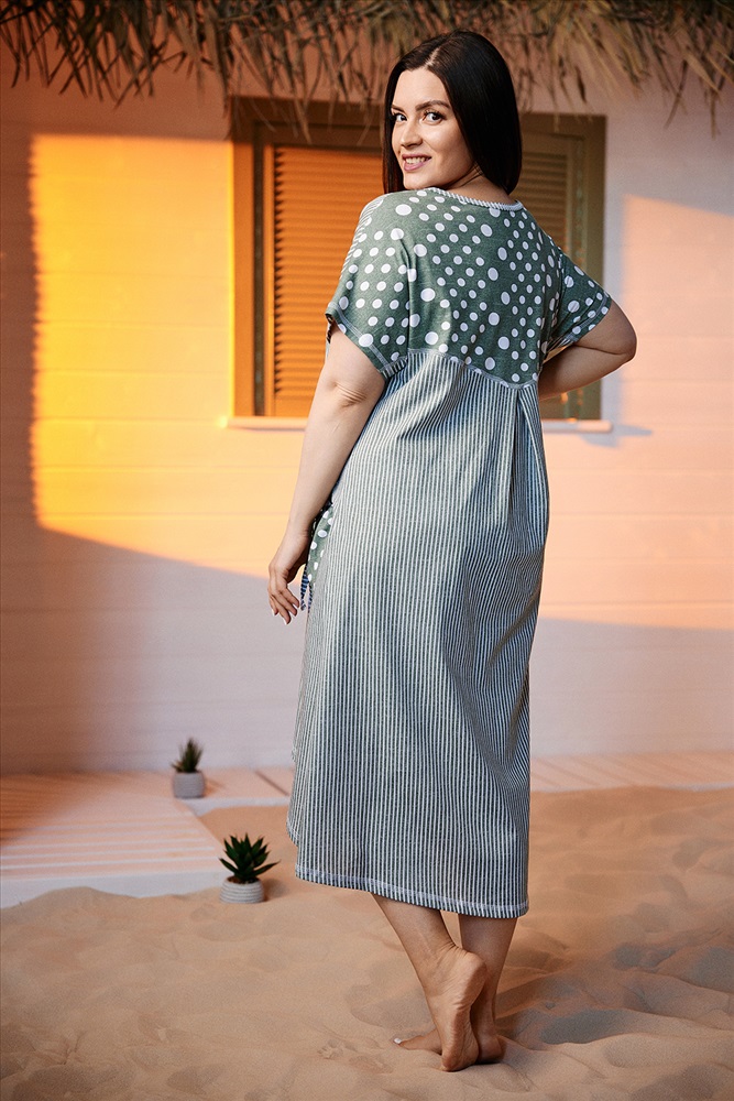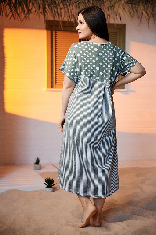 Состав: хлопок 100% Модель: Платье 9198 Тип товара: платье Материал: кулирка | кулирка Бренд: Натали Суслова Длина: длинный | средняя длина Карман: накладные Назначение: для дачи | для дома Отделка: с карманами Рисунок: горошек | полоска Рукав: короткий рукав Сезонность: лето Силуэт: свободный Стиль: домашний Воротник: без воротника Застежка: без застежки Платье женское, свободное, к низу расширенное. Рукав цельнокроенный короткий. Горловина Y-образная. Платье из двух полочек , одна полочка и кокетка спинки: в горошек, другая полочка и спинка: в полоску. На полочке в полоску большой накладной карман из ткани в горошек с декоративной кокосовой пуговицей на завязке. На полочке в горошек чуть ниже линии груди настрочены два хляста с декоративными кокосовыми пуговицами. На спинке сзади складка для обеспечения достаточной свободы по бедрам. Низ платья фигурный, полочка короче спинки. Таблица размеров и веса