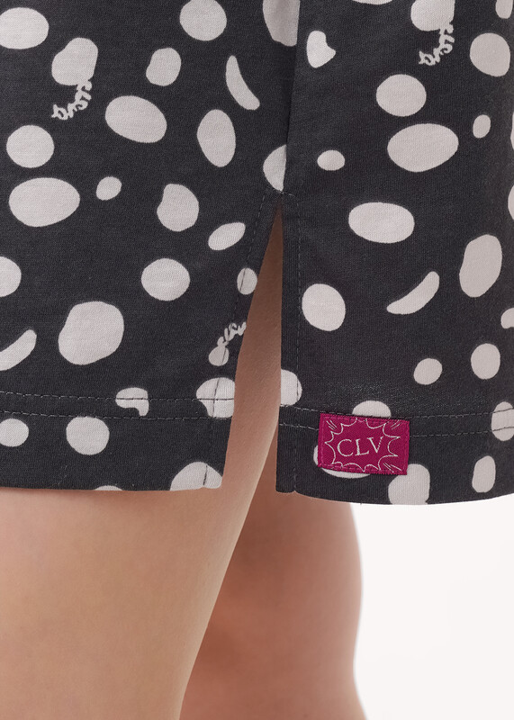 Платье для дома и отдыха из хлопкового трикотажного полотна прямого кроя. Округлая горловина с обтачкой. Короткий втачной рукав. Спереди принт фольга, накладной карман. Боковые разрезы,сзади по низу нашивка.