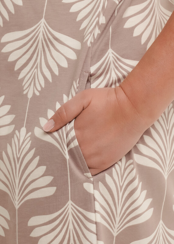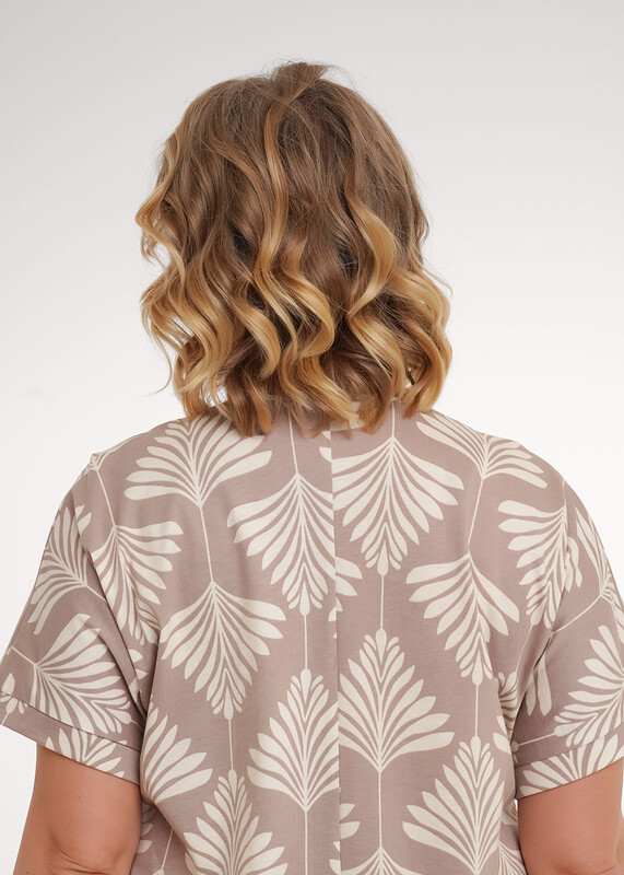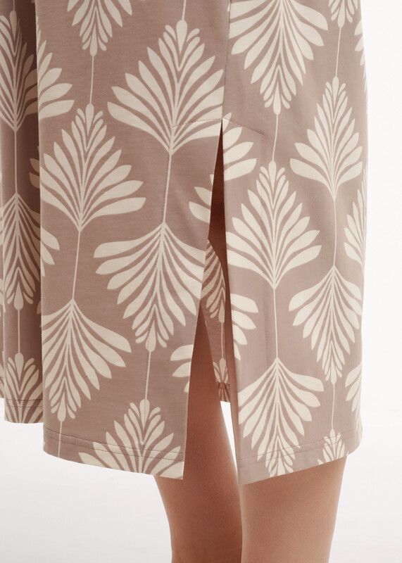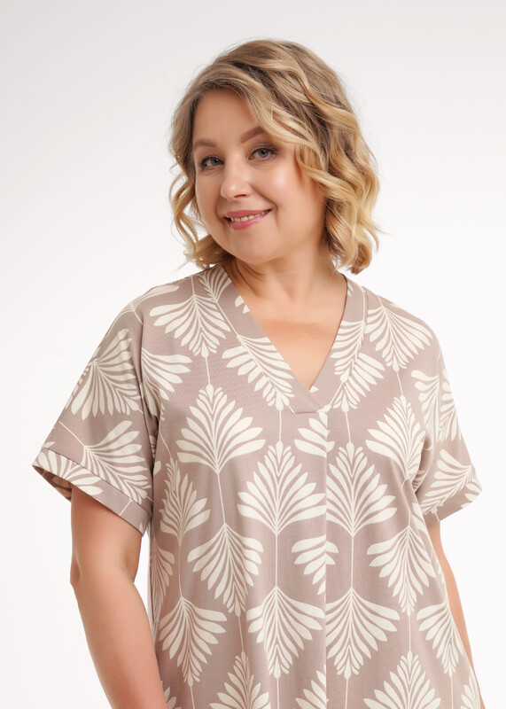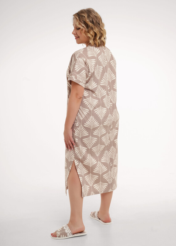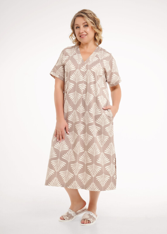 Платье прямого силуэта из хлопкового трикотажного полотна, длиной ниже колена. Короткий цельнокроеный рукав с притачной манжетой по низу. V-образная горловина с обтачкой и складкой по центру. Боковые карманы в шве. По бокам разрезы.По спинке средний шов.