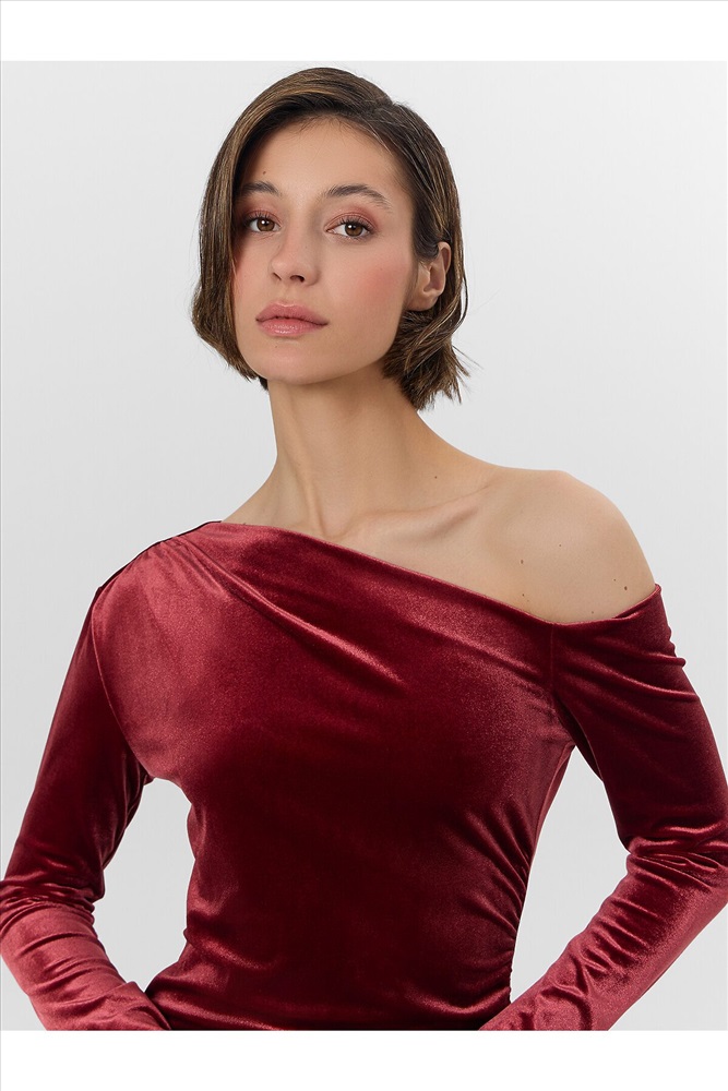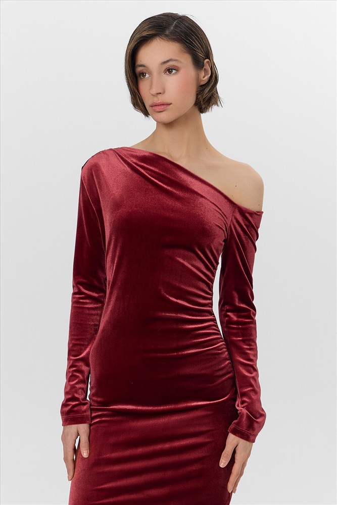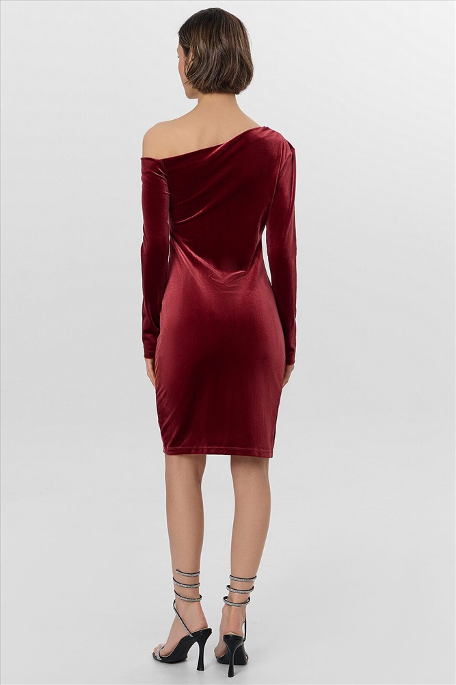 Платье выполнено из велюра с добавлением спандекса, что обеспечивает идеальное облегание и мягкость ткани. Состав из полиэстера и спандекса гарантирует сохранение формы и комфорт при движении.