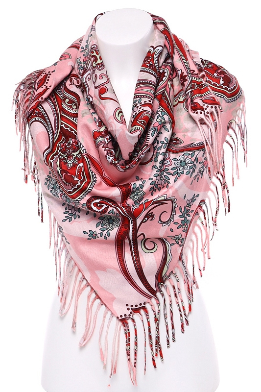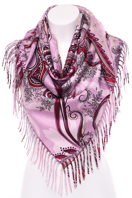 Мягкий, плотный двухсторонний платок. Одна сторона - узор, другая - цветы. На двух противоположных краях кисти, два других заканчиваются кромкой.
