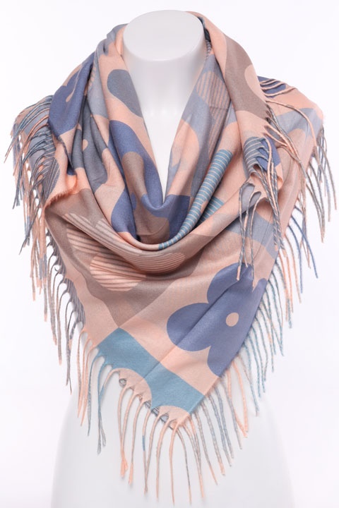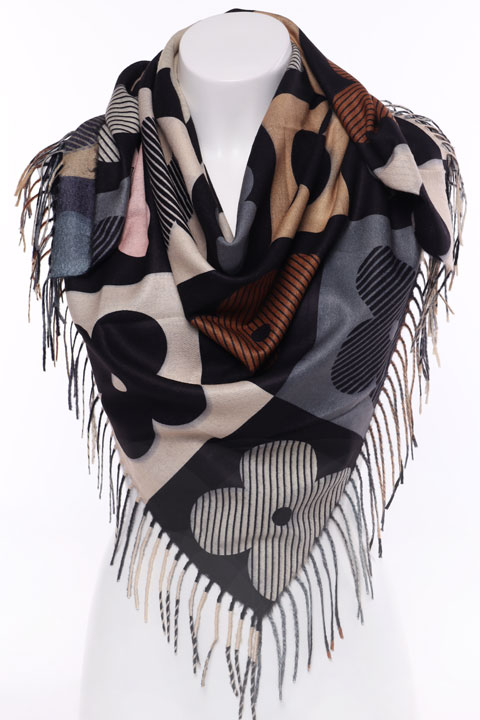 Плотный, мягкий платок. На двух противоположных краях платка кисти, два других заканчиваются кромкой. Размер: 105 х 105 см. (+/- 3 см.) Состав: вискоза, п/э, шерсть Сезон: осень, весна.