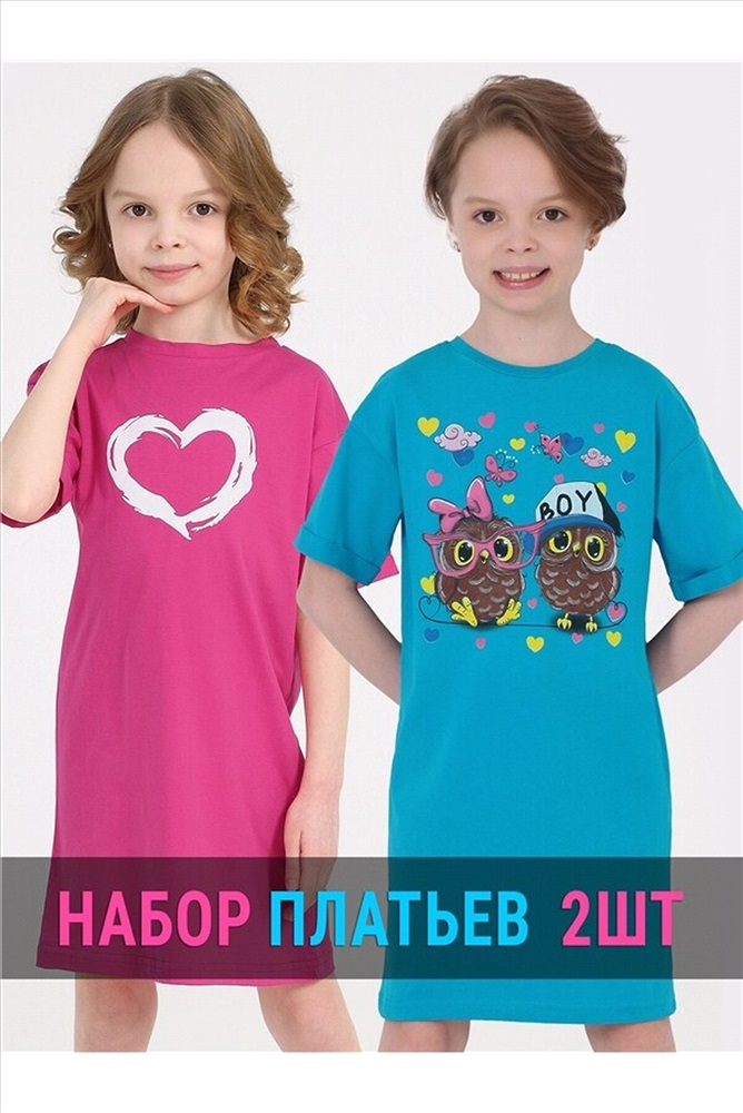 ID товара: 1188443 Состав: Хлопок 100% Сезон: Весна/Лето Длина: Средняя Фасон: Прямое Рукав: Короткие Вырез горловины: Округлый Рисунок: Фантазийный Декоративные элементы: Принт Основная ткань: Хлопок Стиль: Повседневный Страна бренда: Россия Страна производства: Россия Комплект платьев для девочки. Комментарии к товару