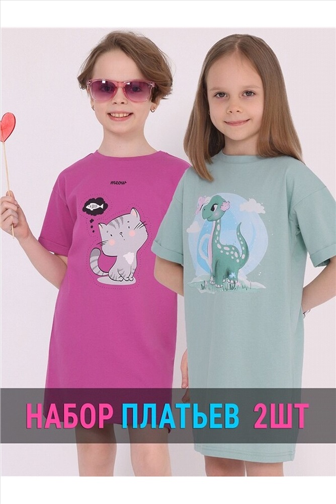 ID товара: 1188444 Состав: Хлопок 100% Сезон: Весна/Лето Длина: Средняя Фасон: Прямое Рукав: Короткие Вырез горловины: Округлый Рисунок: Фантазийный Декоративные элементы: Принт Основная ткань: Хлопок Стиль: Повседневный Страна бренда: Россия Страна производства: Россия Комплект платьев для девочки. Комментарии к товару