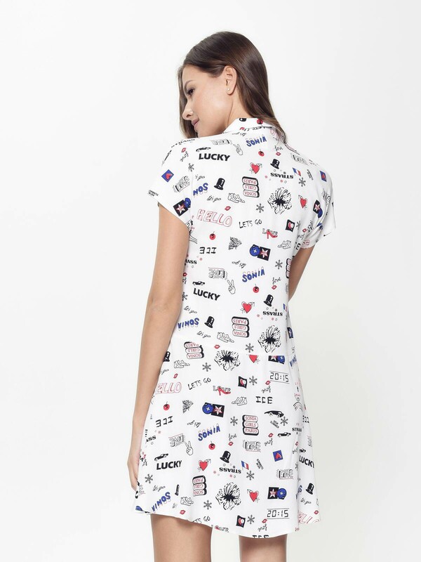 Ультрамодное платье-рубашка из легкого вискозного полотна с отложным воротником и планкой на пуговицах станет вашей любимой вещью для долгих прогулок, шоппинга, свиданий и отдыха. Безупречная посадка по фигуре, абсолютная свобода движений и яркий летний принт "new summer" - в этом платье вы будете неотразимы. Готовьтесь принимать комплименты!