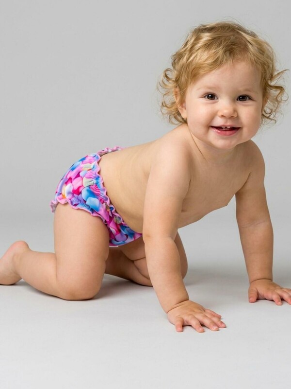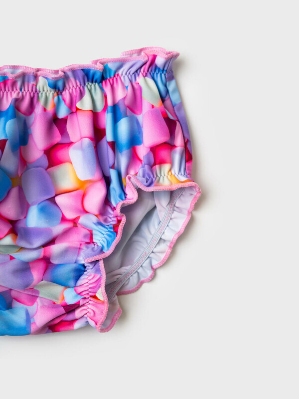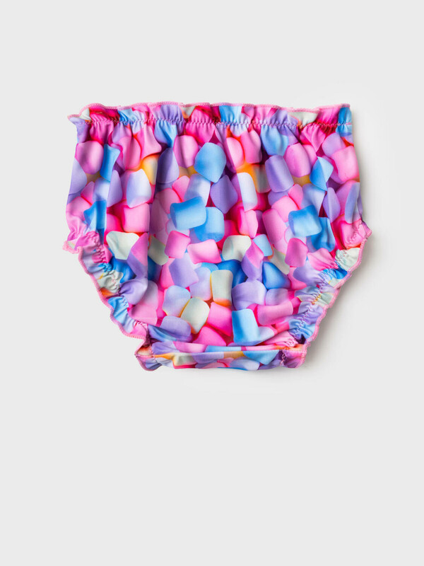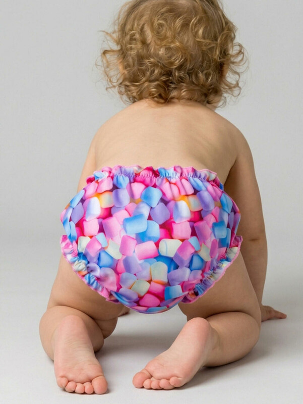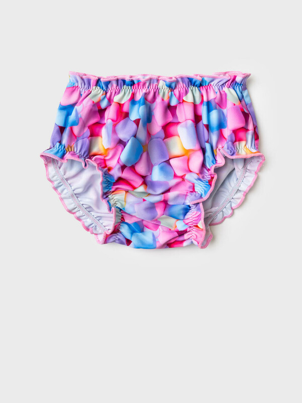 Детские плавки для девочки. Модель с красочным принтом в виде маршмеллоу и высокой посадкой. Внутри предусмотрена подкладка. Края обработаны мягкой эластичной тесьмой и декоративной строчкой. Эластичная отделка по талии и ножкам обеспечивает удобство и хорошую посадку.
