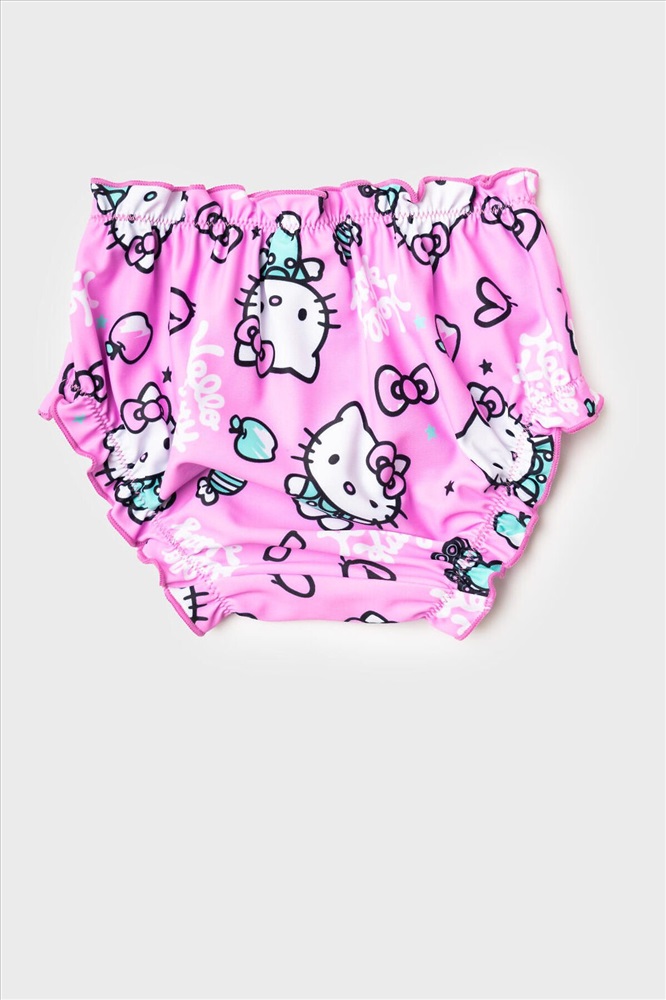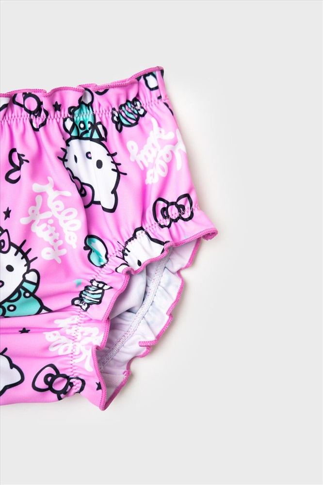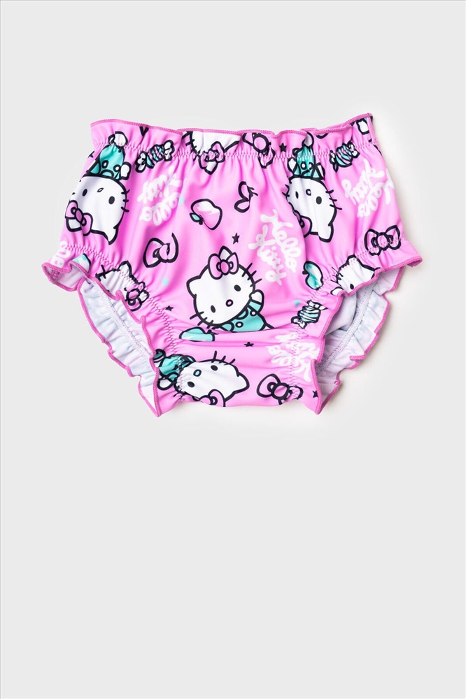 Плавки детские для девочки с рисунком Hello Kitty. Выполнены в розовом цвете с весёлым принтом: кошечка Hello Kitty, конфетки, сердечки и очки. Спереди пояс украшен маленьким розовым бантиком. Плавки мягко облегают фигуру за счёт эластичных резинок в поясе и по краям ножек. Внутри — хлопковая ластовица для комфорта. Благодаря UF-защите, ткань сохраняет первоначальный вид даже при длительном пребывании на солнце. Прекрасный выбор для лета и пляжа.