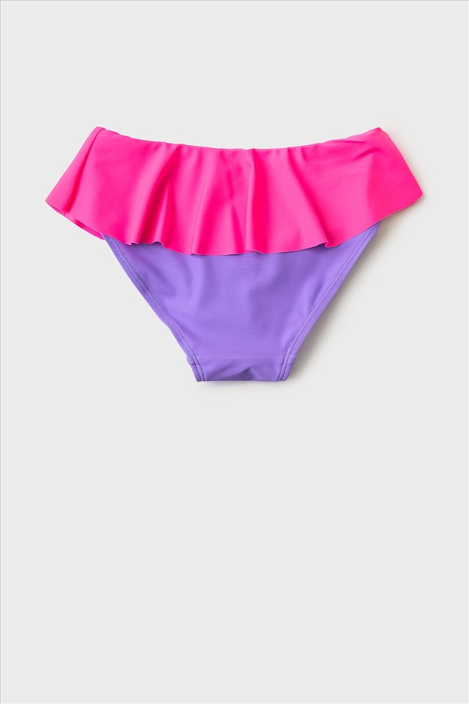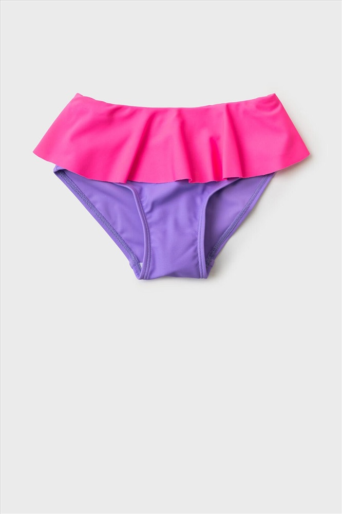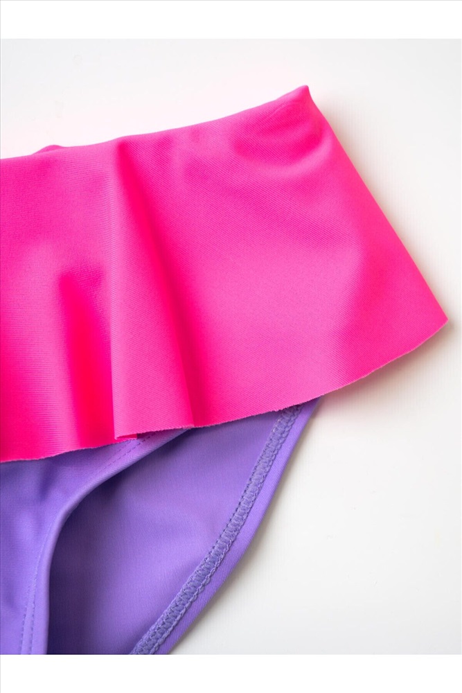 Купальные детские плавки для девочки. Модель с низкой посадкой, выполнена в сиреневом цвете с широким розовым воланом по талии. Для удобства в поясе вшита эластичная резинка, а вырезы для ножек обработаны мягкой латексной резинкой. Внутри предусмотрена ластовица с подкладкой. Благодаря UF-защите, ткань сохраняет первоначальный вид даже при длительном пребывании на солнце. Подходит для плавания и активного отдыха.