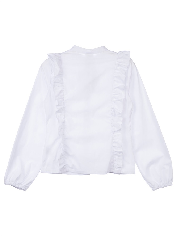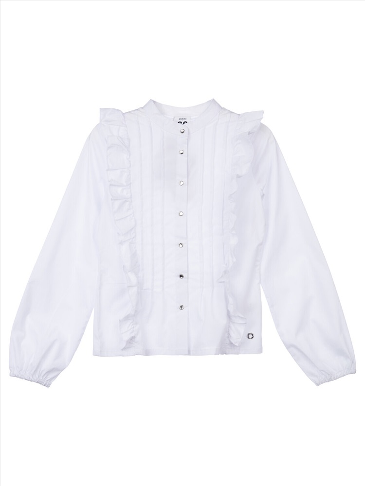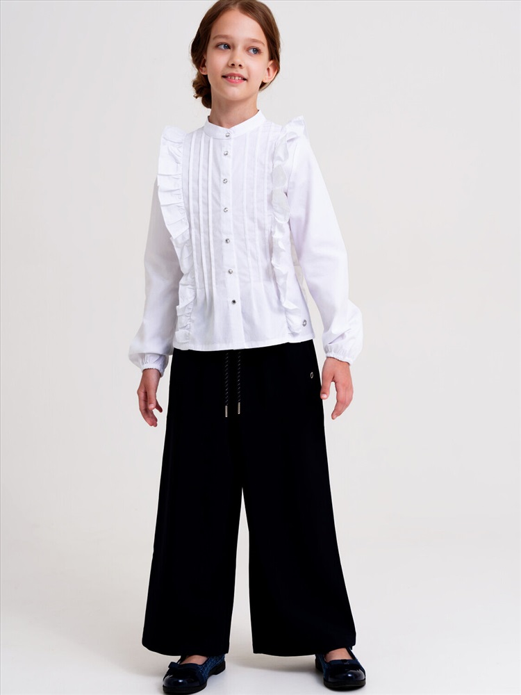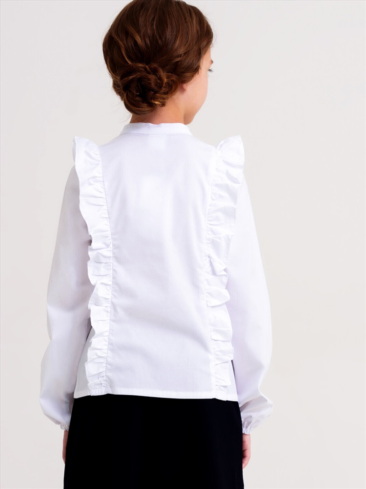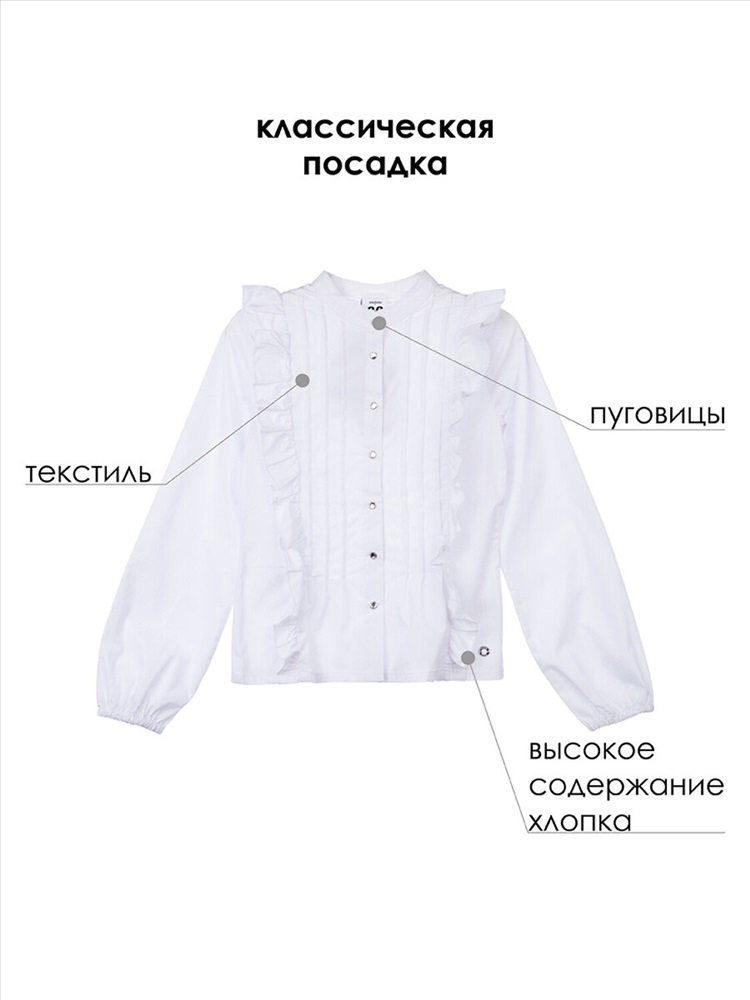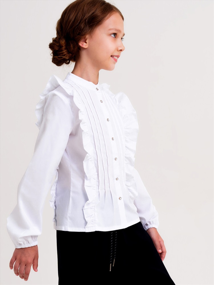 Белая нарядная текстильная блузка прямого силуэта, приталенная для девочки подростка. Школьная блузка на кнопках хорошо держит форму, комфортна в носке и проста в уходе. Высокое содержание хлопка. Рубашка в школу с длинным рукавом и интересным дизайном разнообразит повседневные школьные образы.
